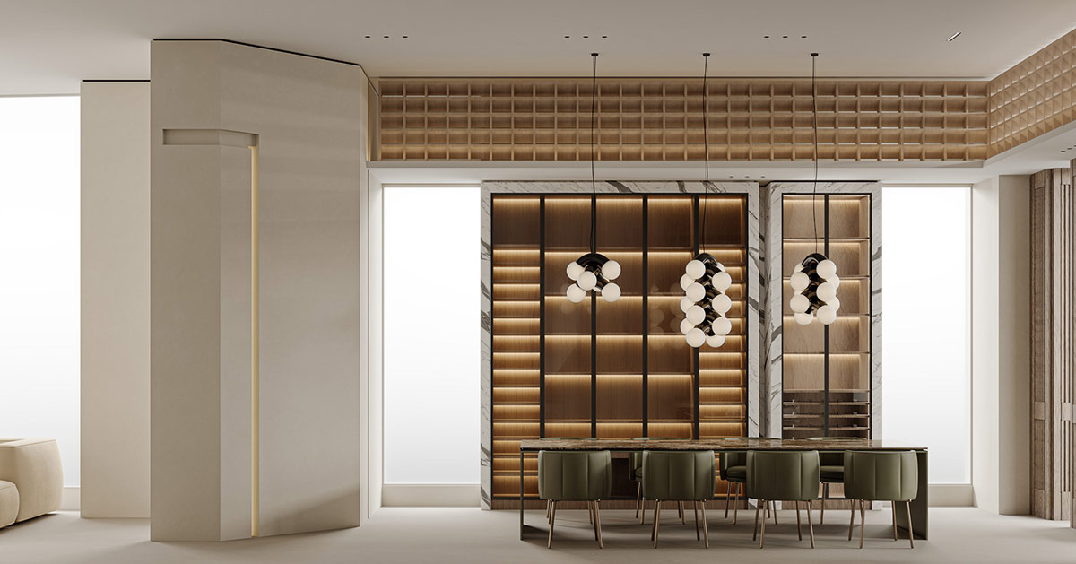 夢幻般的家具為這個(gè)酷酷的奶油色內(nèi)飾帶來了形狀創(chuàng)意的精髓,由中國渲染師夢太初形象化。雖然這里的裝飾主要是灰白的,但對比的時(shí)刻產(chǎn)生了清晰度和戲劇性。