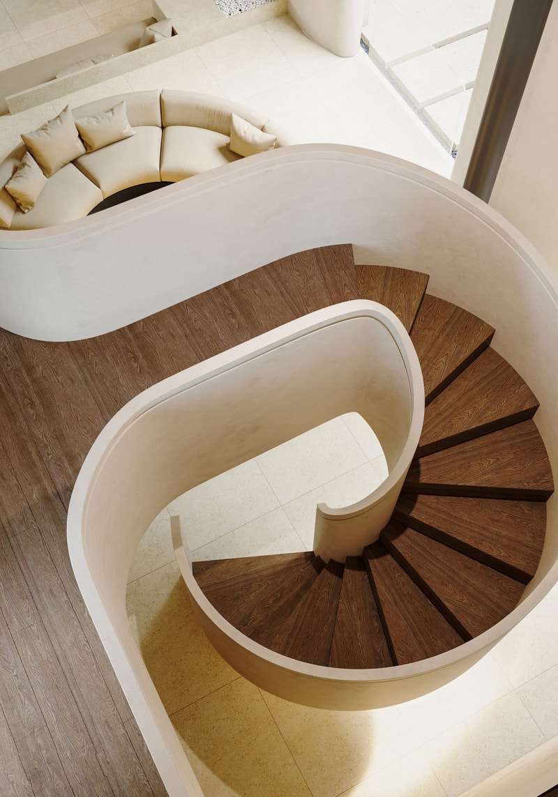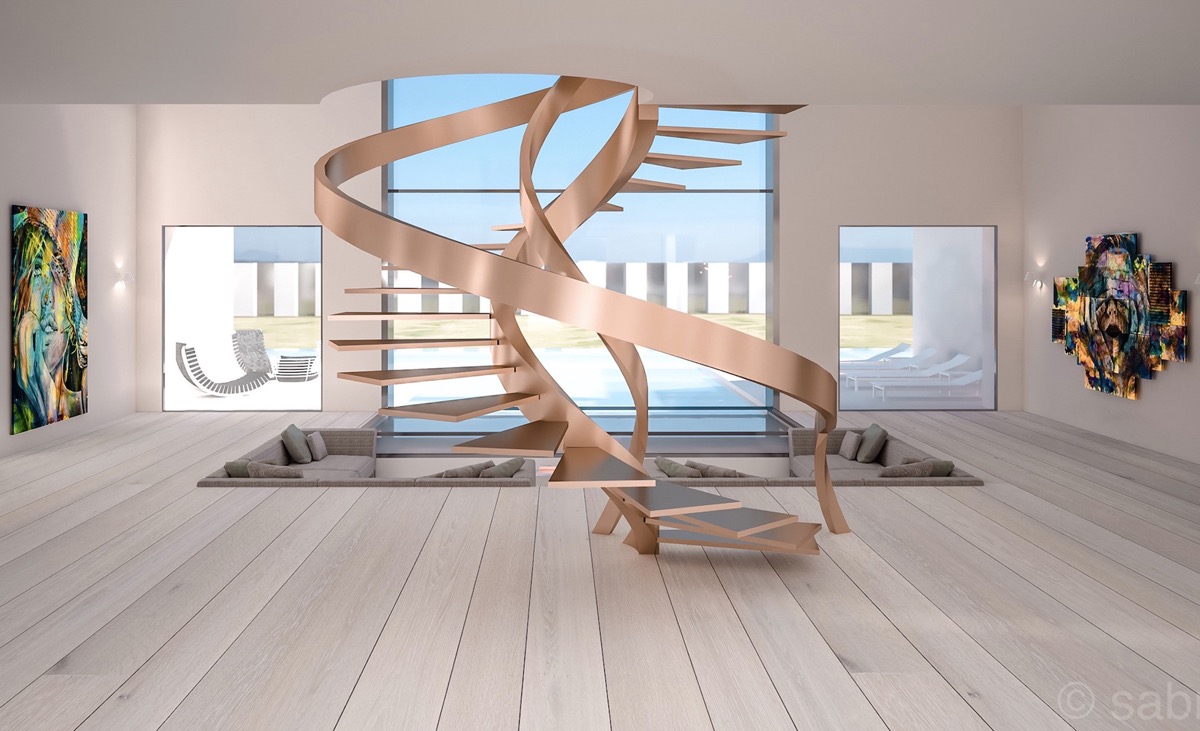 蝸牛殼別致,這個(gè)神話般的旋轉(zhuǎn)樓梯裝置下方的凹痕創(chuàng)造了一個(gè)解開的蝸牛殼的美感。