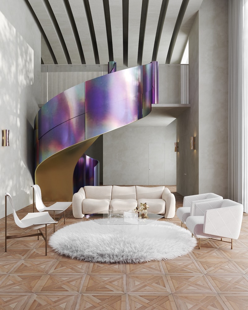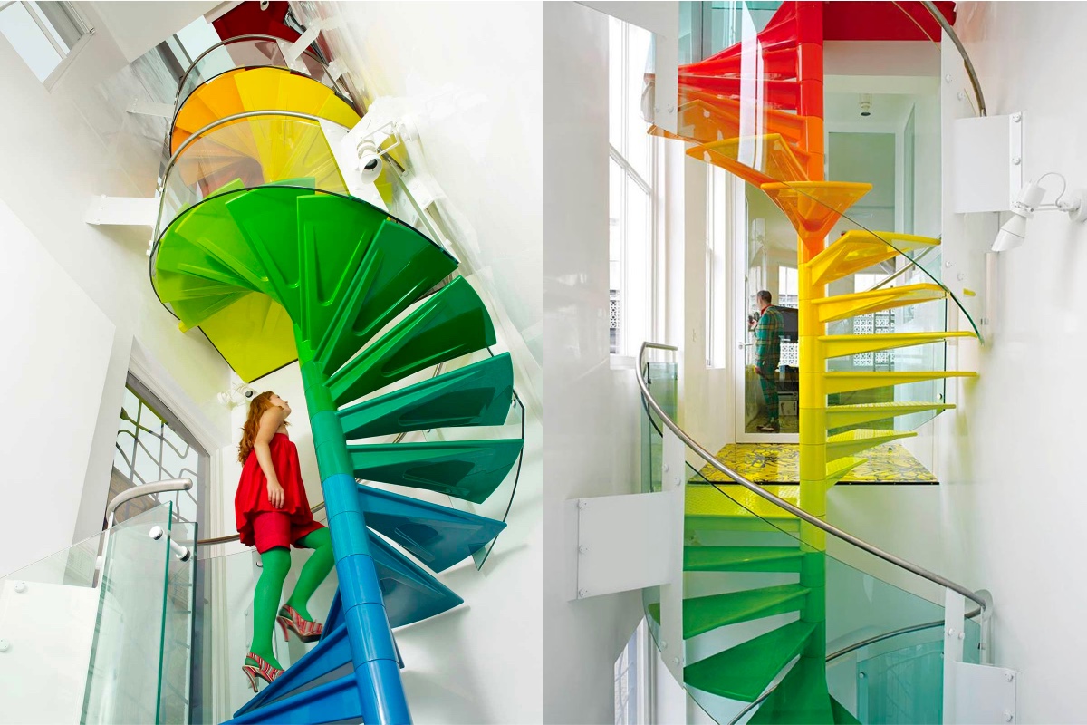 如果您渴望獲得更多色彩,那么在繞線器周圍采用漸變彩虹飾面來加強(qiáng)您明亮的螺旋樓梯設(shè)計(jì)。