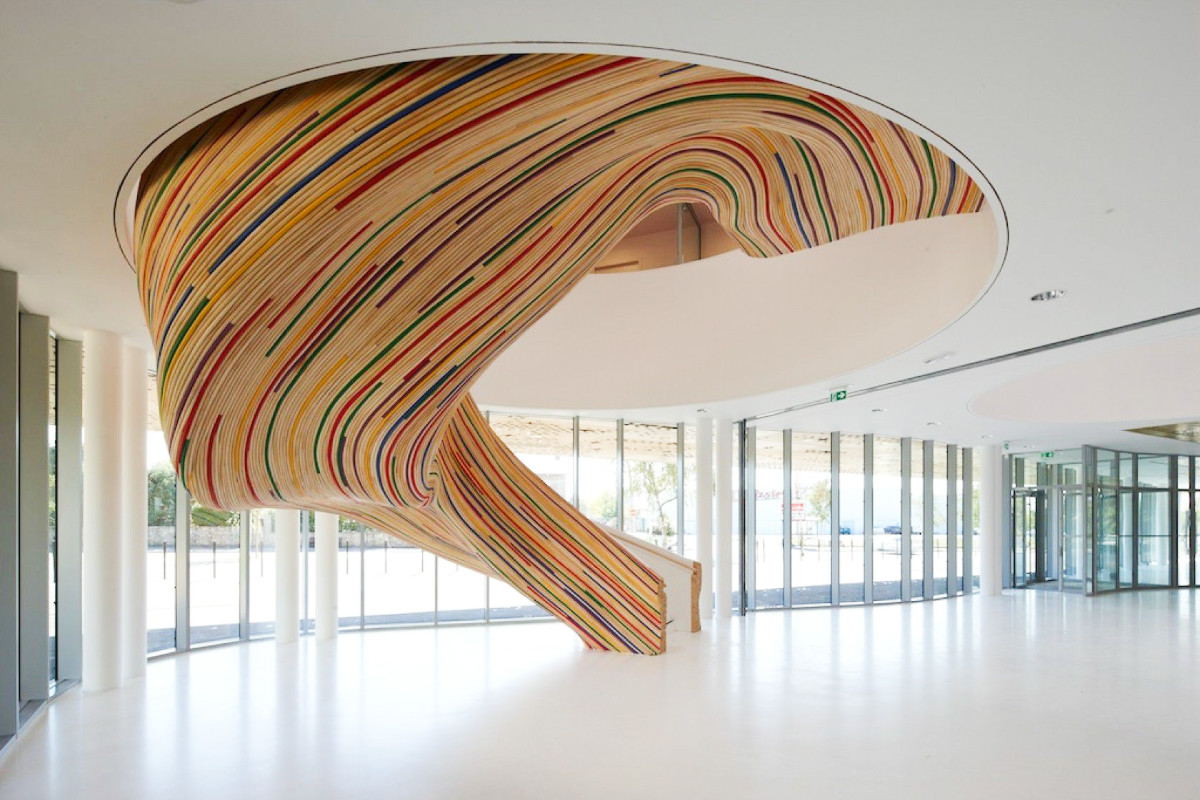 看起來像是從愛德華·蒙克(Edvard Munch) 的畫作《吶喊》(The Scream) 旋轉(zhuǎn)的天空中迸發(fā)出來的,這座藝術(shù)自由形式的樓梯飾有醒目的色彩條紋。