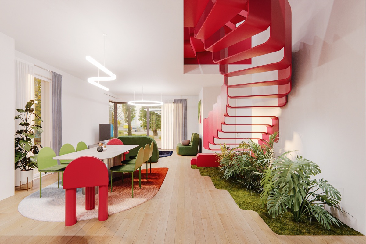 紅色的鐵軌,在這個(gè)令人難以置信的獨(dú)特螺旋樓梯設(shè)計(jì)中,明亮的紅色踏板沒有立管,它懸掛在一個(gè)對(duì)比鮮明的綠色庭院上方,有自己的階梯邊界。顏色協(xié)調(diào)的家具在附近聚集了一個(gè)支持調(diào)色板。