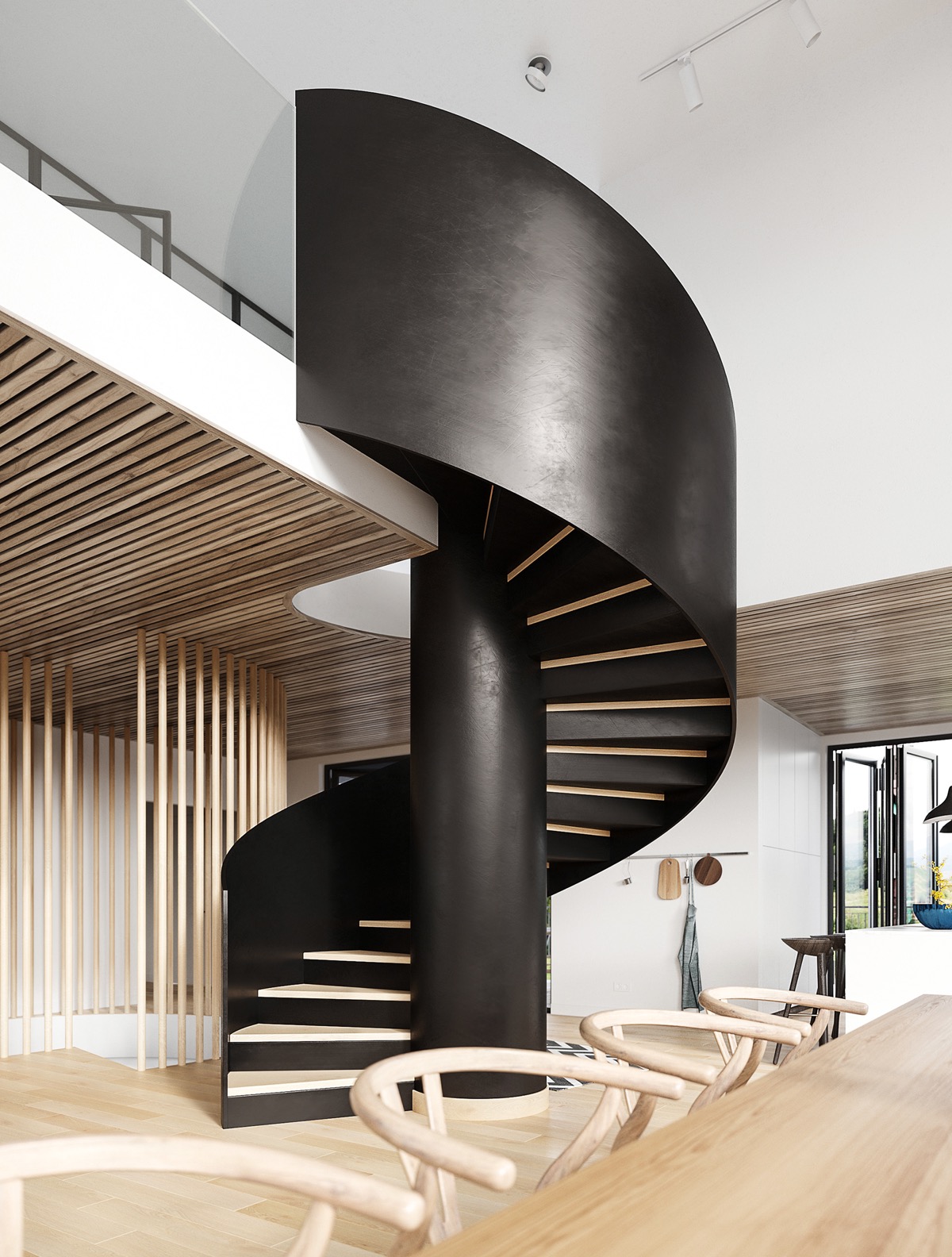啞光黑色和蜿蜒曲折的螺旋樓梯在寬敞的開放式平面圖中占主導(dǎo)地位,表現(xiàn)出完全的專業(yè)精神。