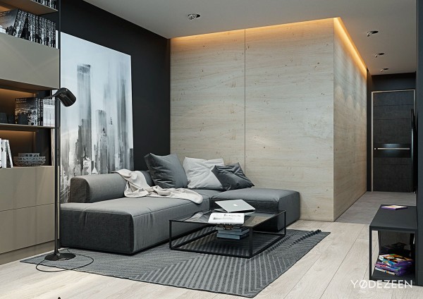 這間一室公寓采用現(xiàn)代單色主題搭配光滑的膠合板墻板。緊湊的客廳布置為整個家庭中的智能節(jié)省空間解決方案樹立了標(biāo)準(zhǔn)。