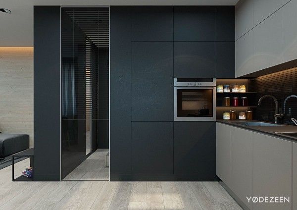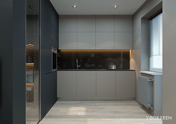 廚房非常簡約。左側(cè)的啞光黑色鑲板讓中性櫥柜脫穎而出。