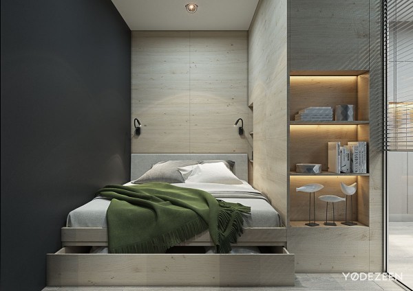 雖然初是一個真正的工作室布局,但設(shè)計(jì)師為臥室提供了自己的各種附件。滑動玻璃門可以提供充足的陽光,儲物墻提供足夠的隱私。