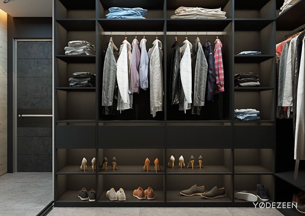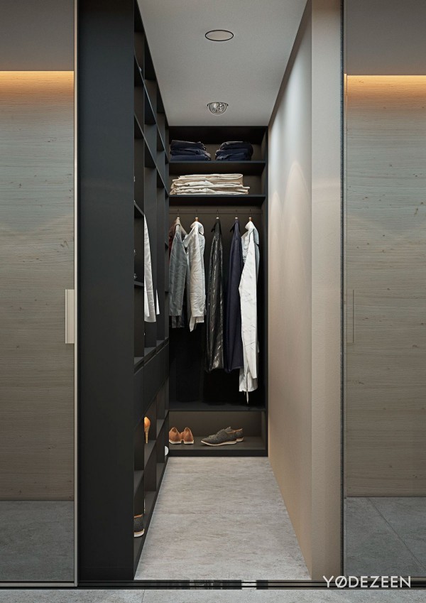 在入口附近,更多的滑動鏡子隱藏了一個方便的衣帽間,里面有住戶出門所需的一切。間接照明使得即使在像這里這樣黑暗的空間中也可以找到任何物品。