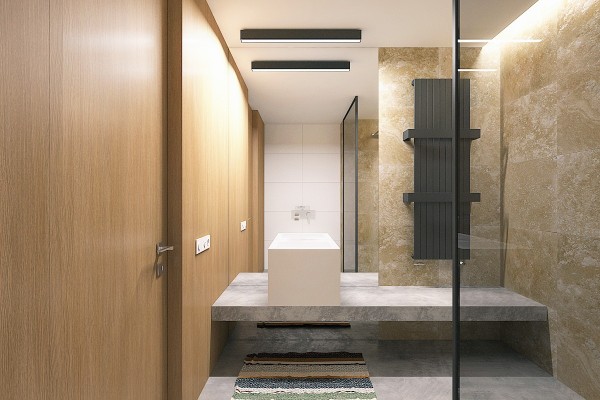 低調(diào)的水平瓷磚讓浴室感覺更寬敞,它們統(tǒng)一的布置引起了對天花板高度的關(guān)注——對于像這樣狹窄的浴室來說,這是一個明智的選擇。