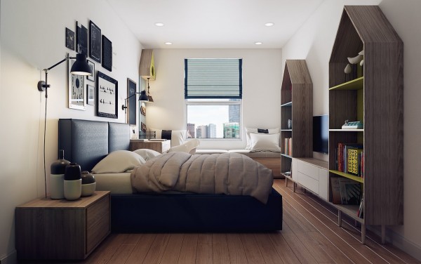 這間臥室還很好地利用了床上方的帶框印刷品,以彌補略微偏離中心的位置。