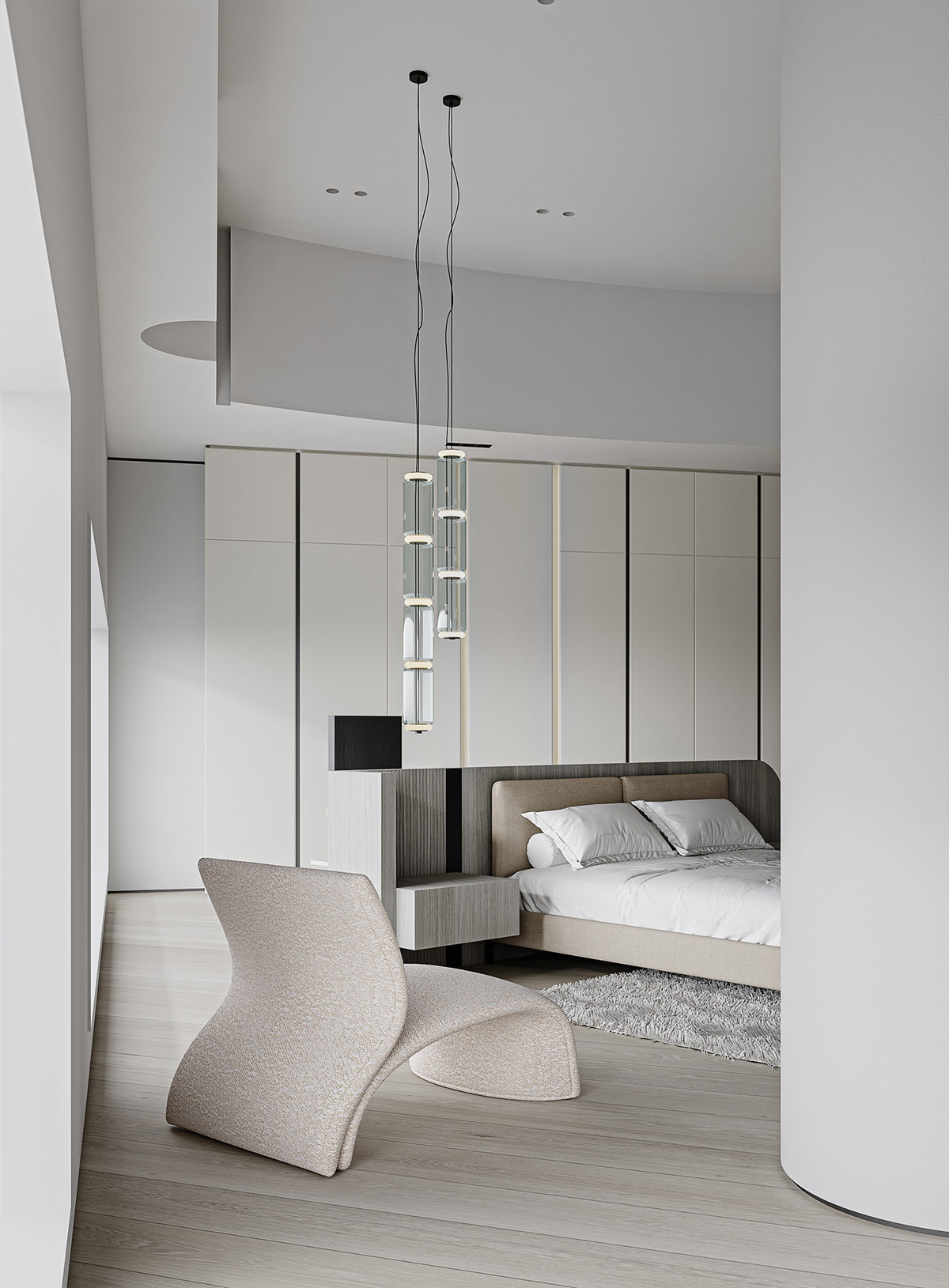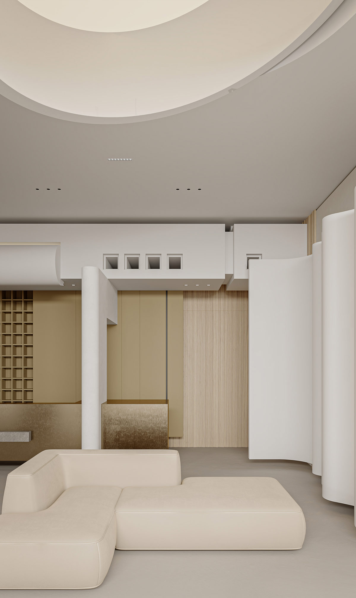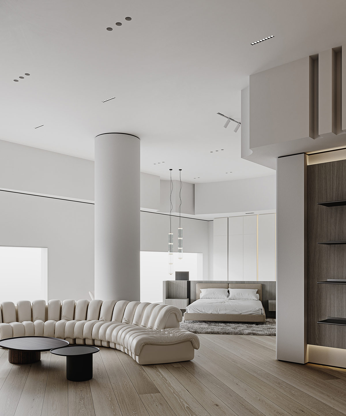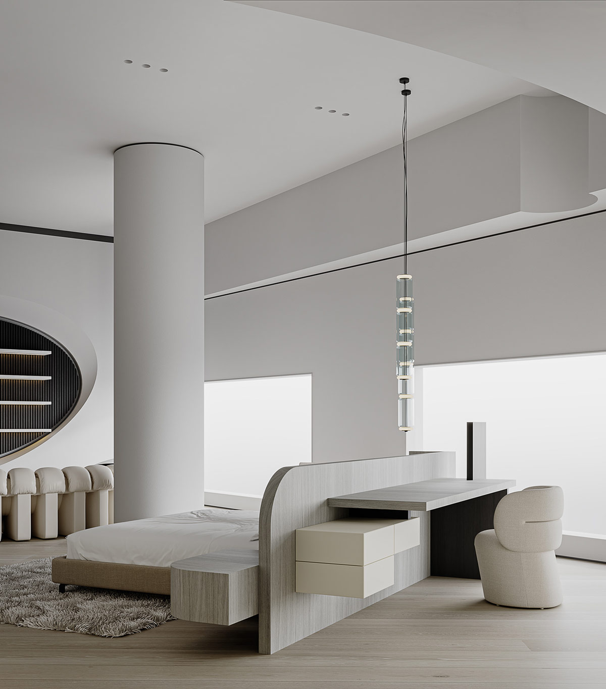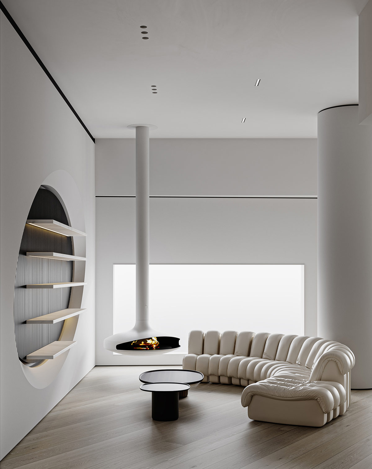 夢幻般的家具為這個酷酷的奶油色內(nèi)飾帶來了形狀創(chuàng)意的精髓,由中國渲染師夢太初形象化。雖然這里的裝飾主要是灰白的,但對比的時刻產(chǎn)生了清晰度和戲劇性。