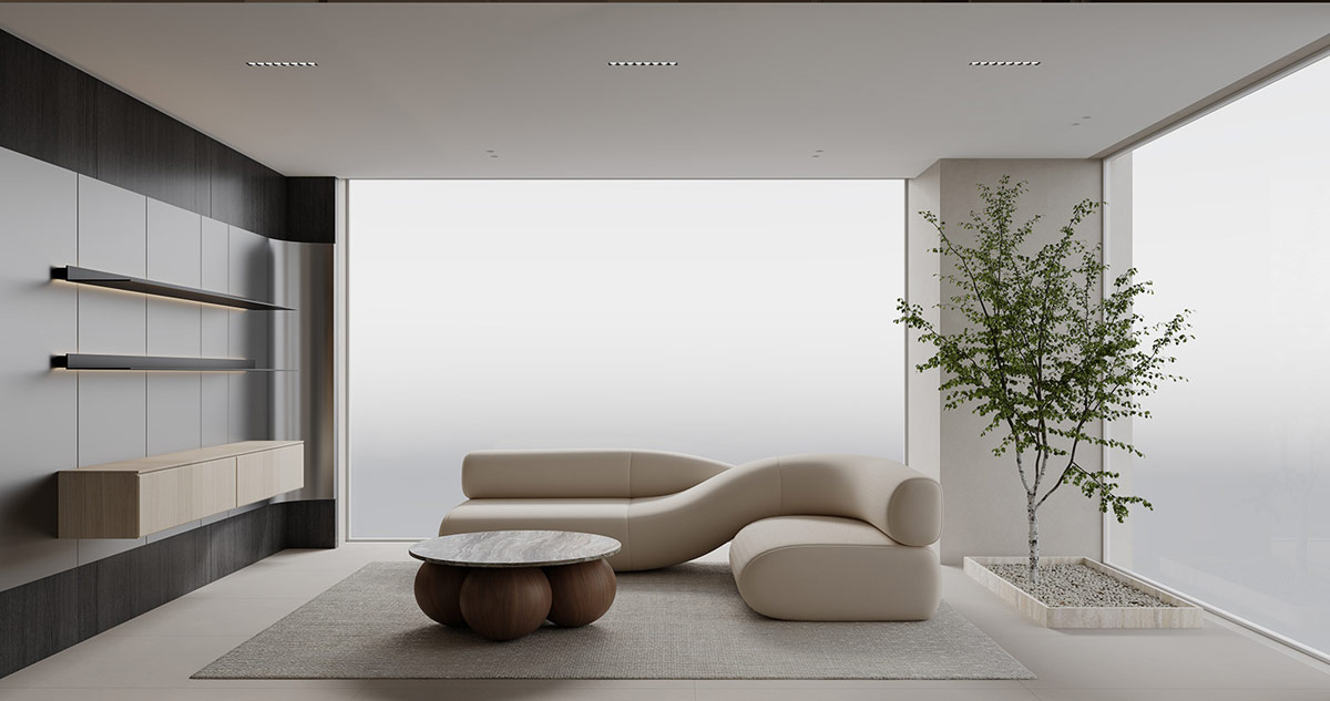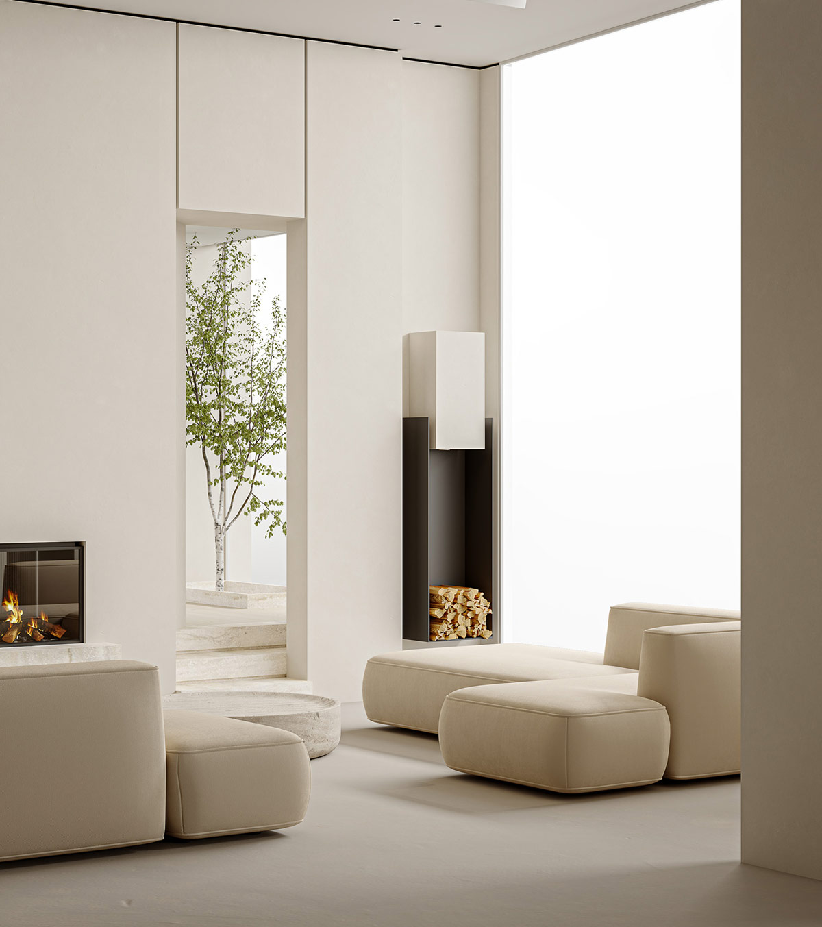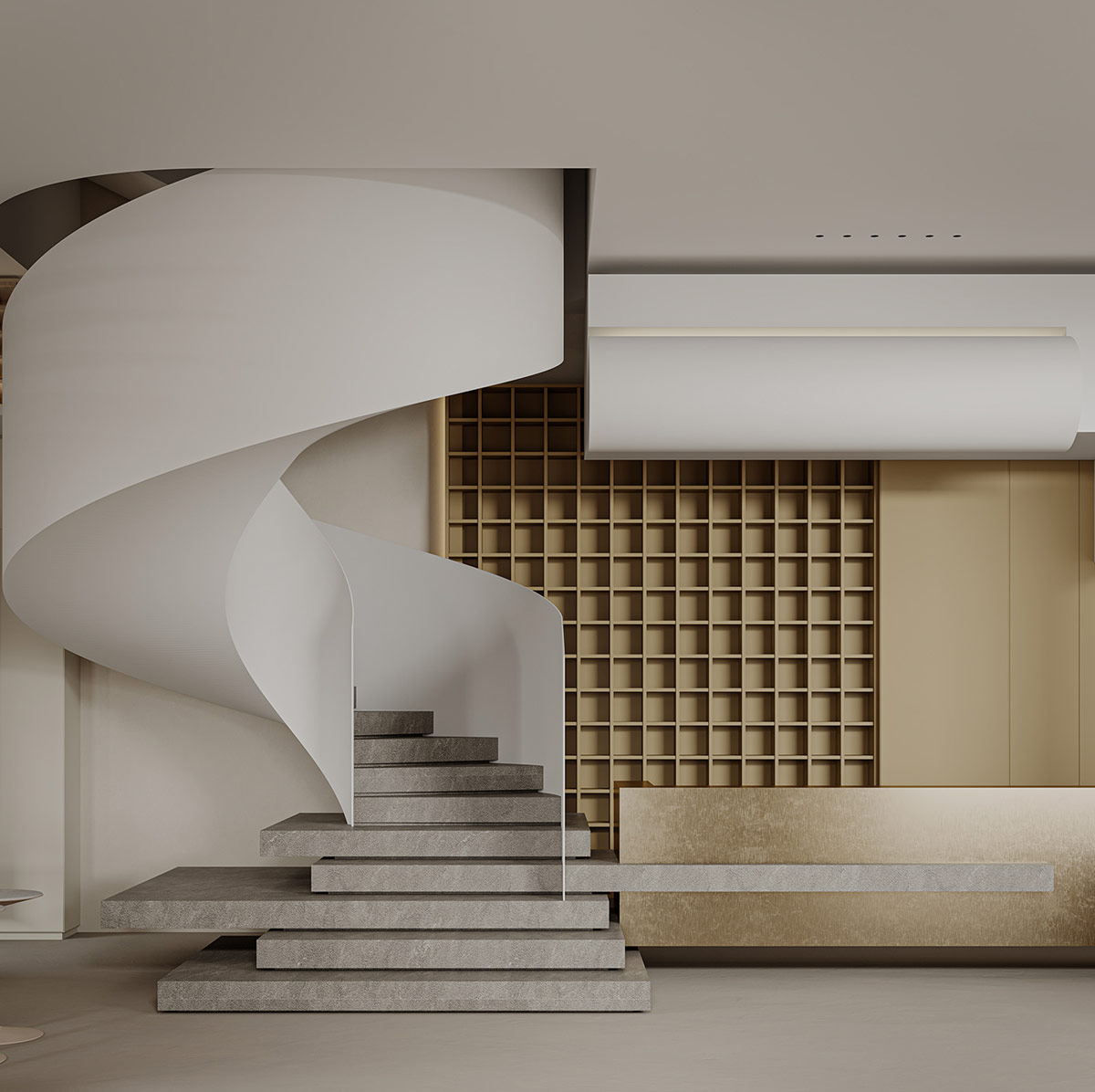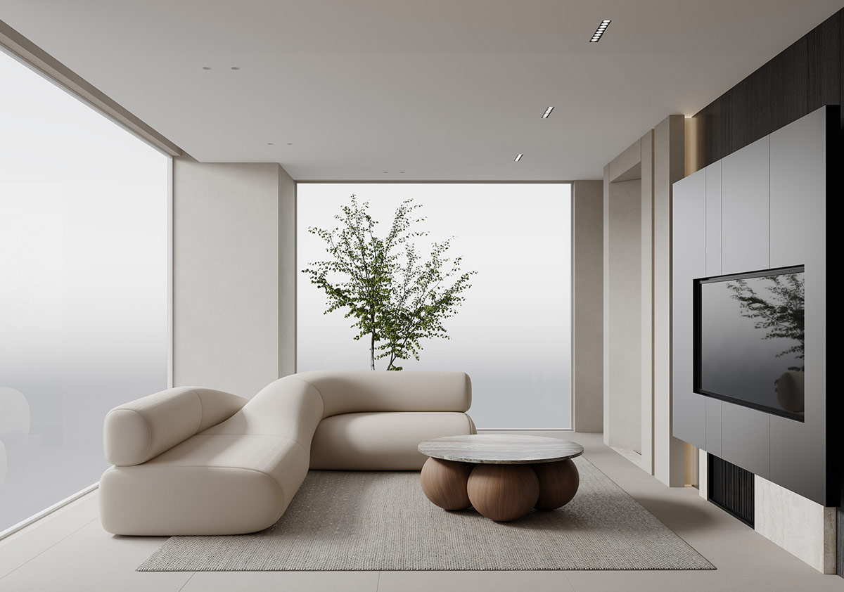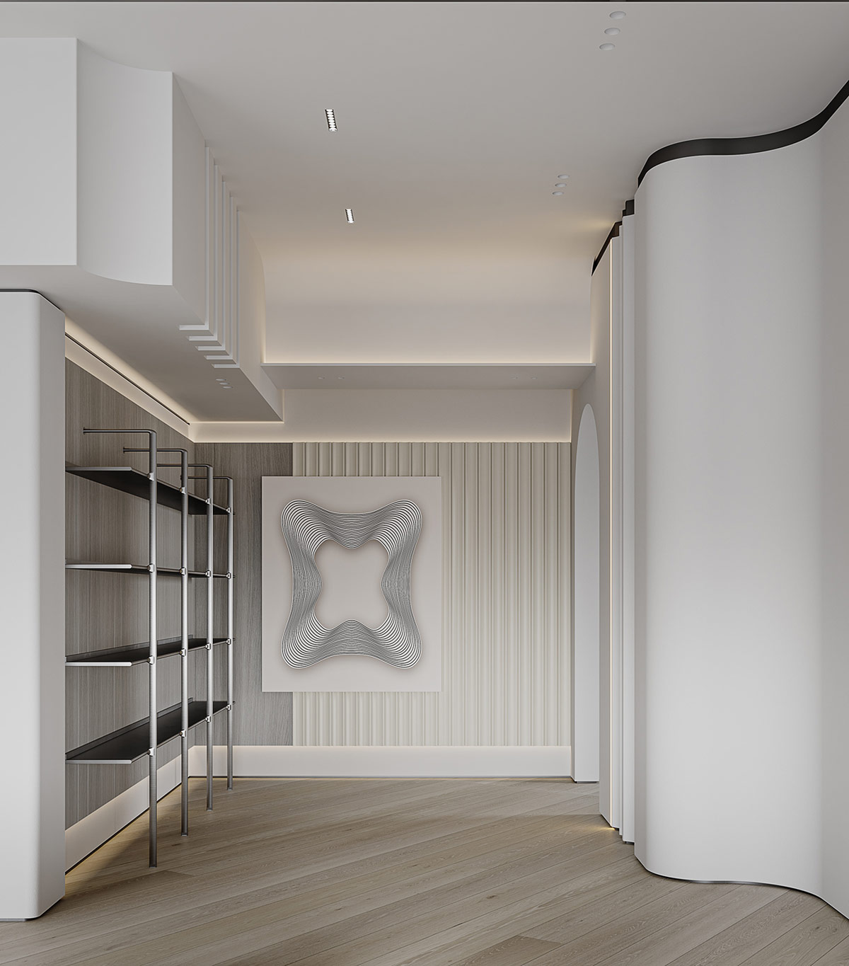 夢幻般的家具為這個酷酷的奶油色內(nèi)飾帶來了形狀創(chuàng)意的精髓,由中國渲染師夢太初形象化。雖然這里的裝飾主要是灰白的,但對比的時刻產(chǎn)生了清晰度和戲劇性。