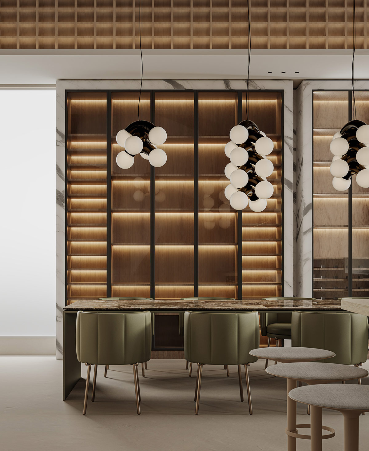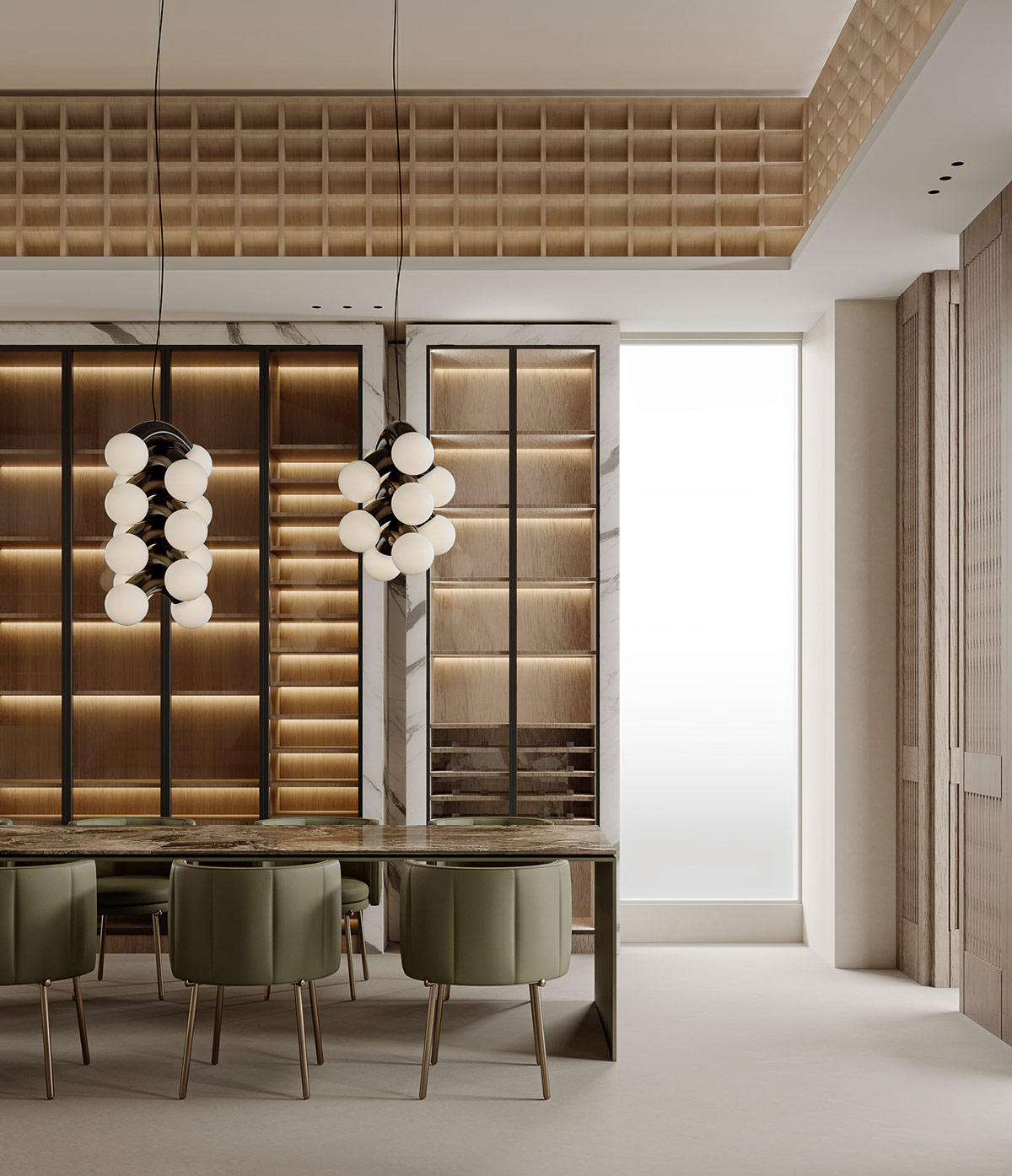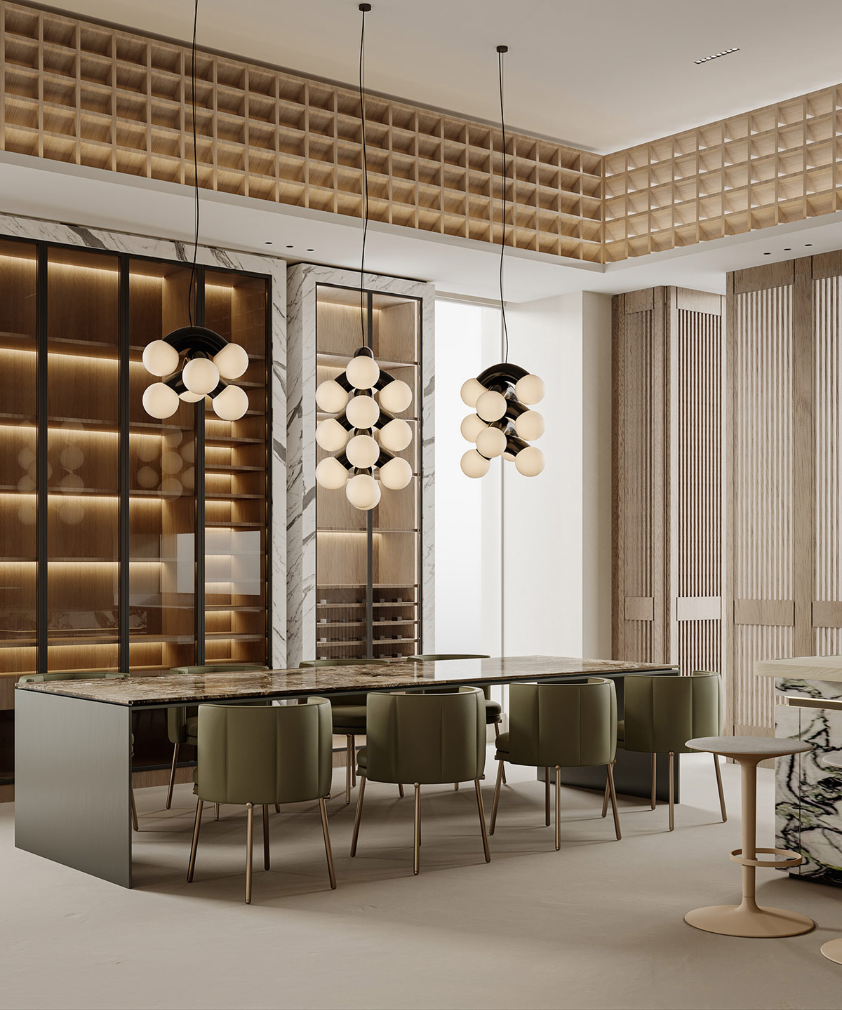 現(xiàn)代線性懸掛燈照亮華麗的大理石島設計。綠色點綴在大理石飾面上旋轉(zhuǎn),與相鄰的餐椅形成微妙的色彩聯(lián)系。