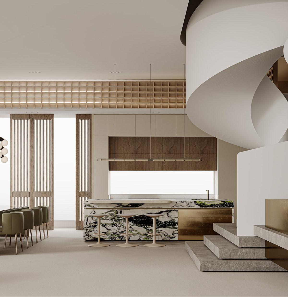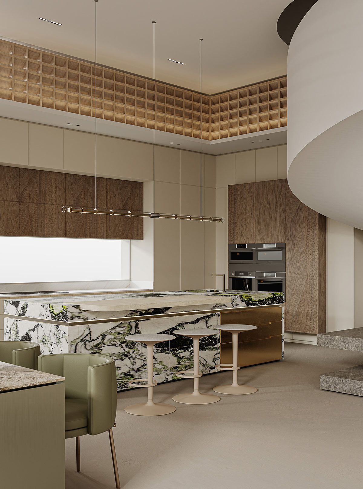 純奶油色單元輕輕地勾勒出廚房裝置的背面,胡桃木壁單元增添了豐富的核心。閃亮的金色抽屜單元突出了通往樓梯的獨特廚房島臺設計的盡頭。