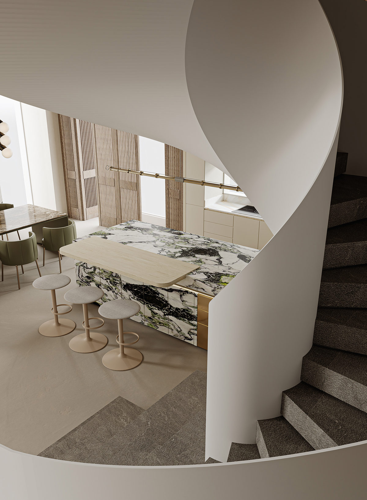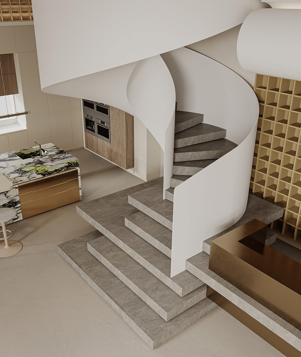 高高的天花板、寬敞的房間、精心制作的內(nèi)置插件和高端材料營造出無可否認的奢華感。精湛的螺旋樓梯設計穿過豪華的起居空間,錯落有致的實心混凝土踏板和雕塑般的旋轉(zhuǎn)欄桿展現(xiàn)出非凡的效果。