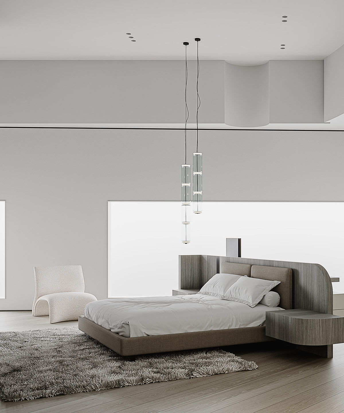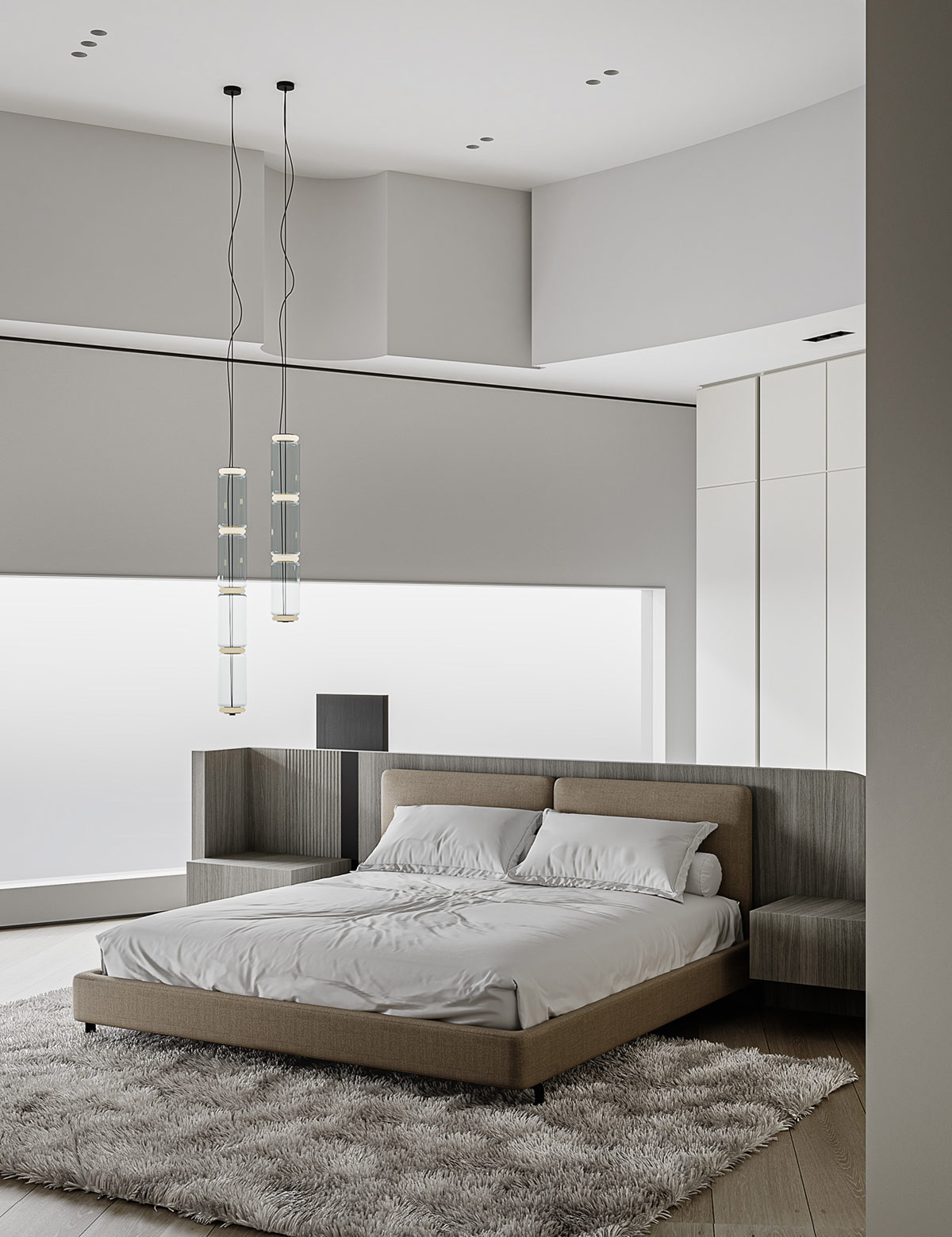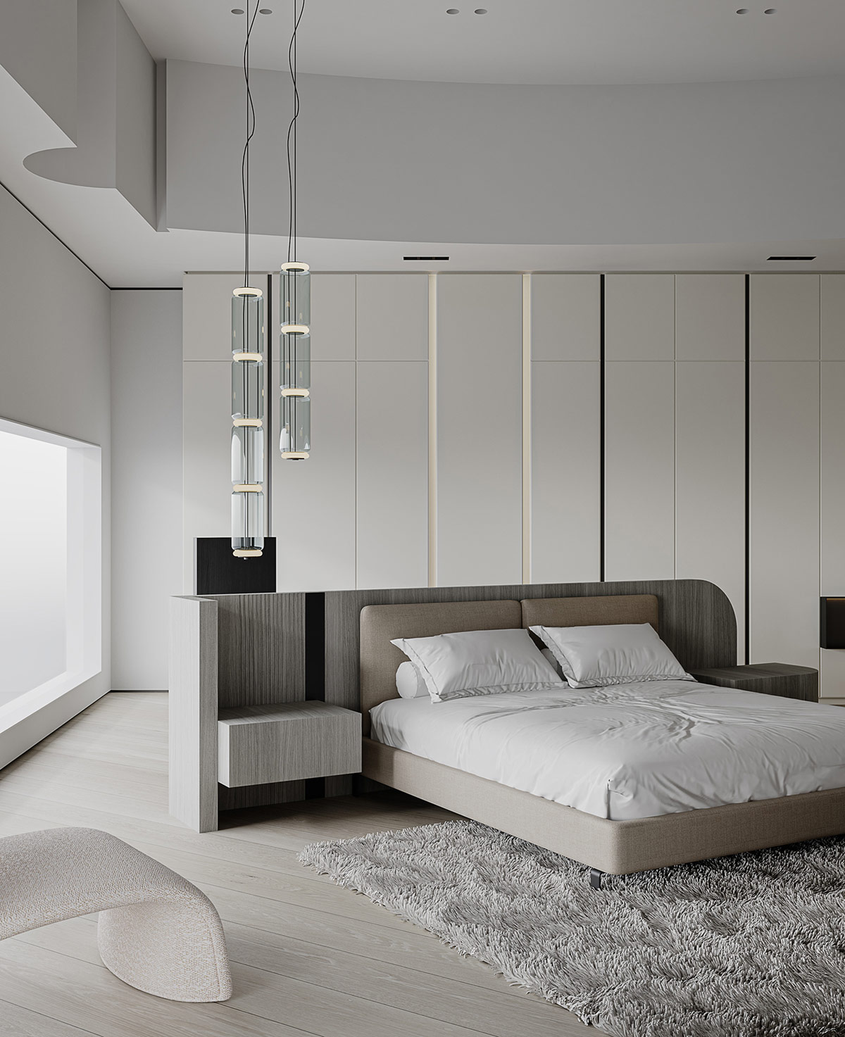 兩盞現(xiàn)代玻璃臥室吊燈從床的一側(cè)下降,白天它們也很吸引人地從窗戶捕捉自然光。