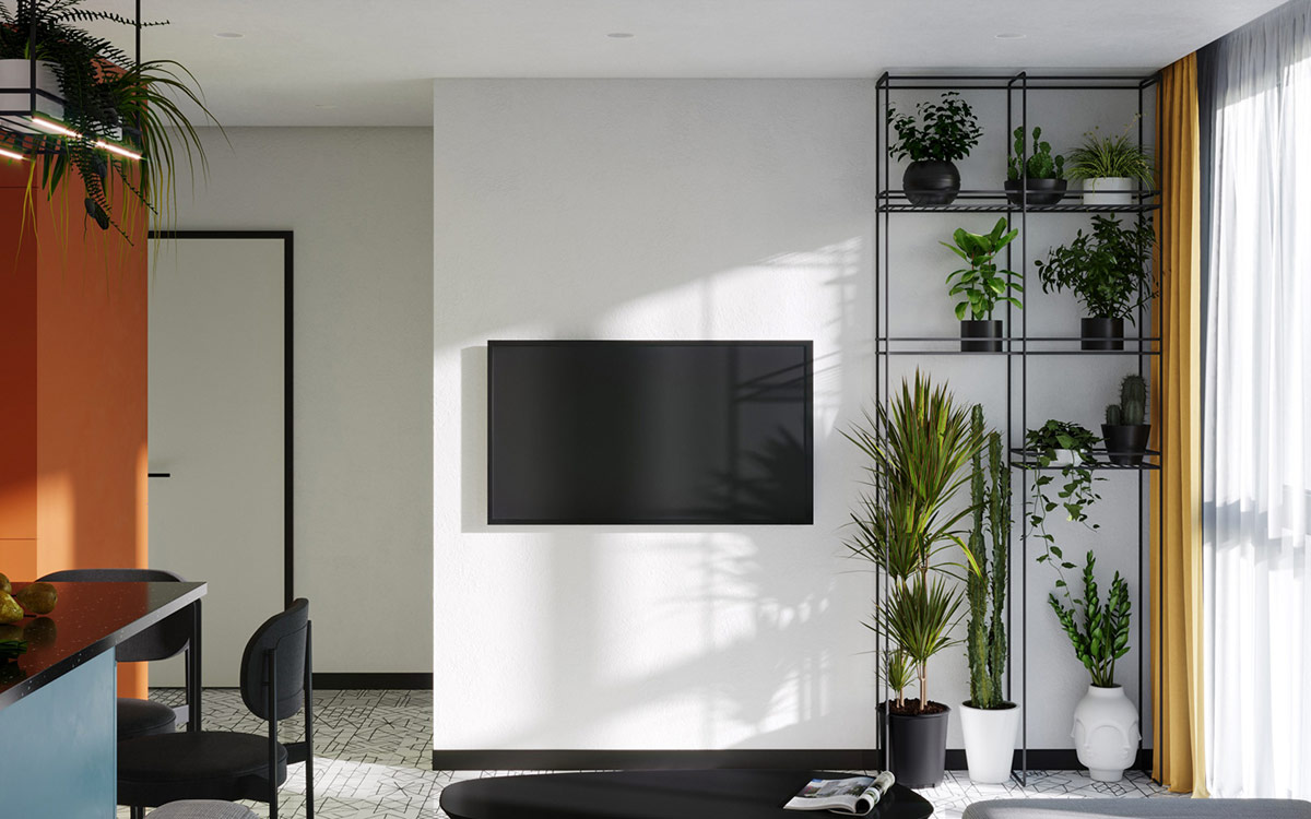 大量的室內(nèi)植物被布置在一個黑色的線框擱架單元上,位于窗戶旁邊,以確保它們獲得充足的陽光。這些植物在平坦的白色電視墻上長出一種有吸引力的紋理特征。