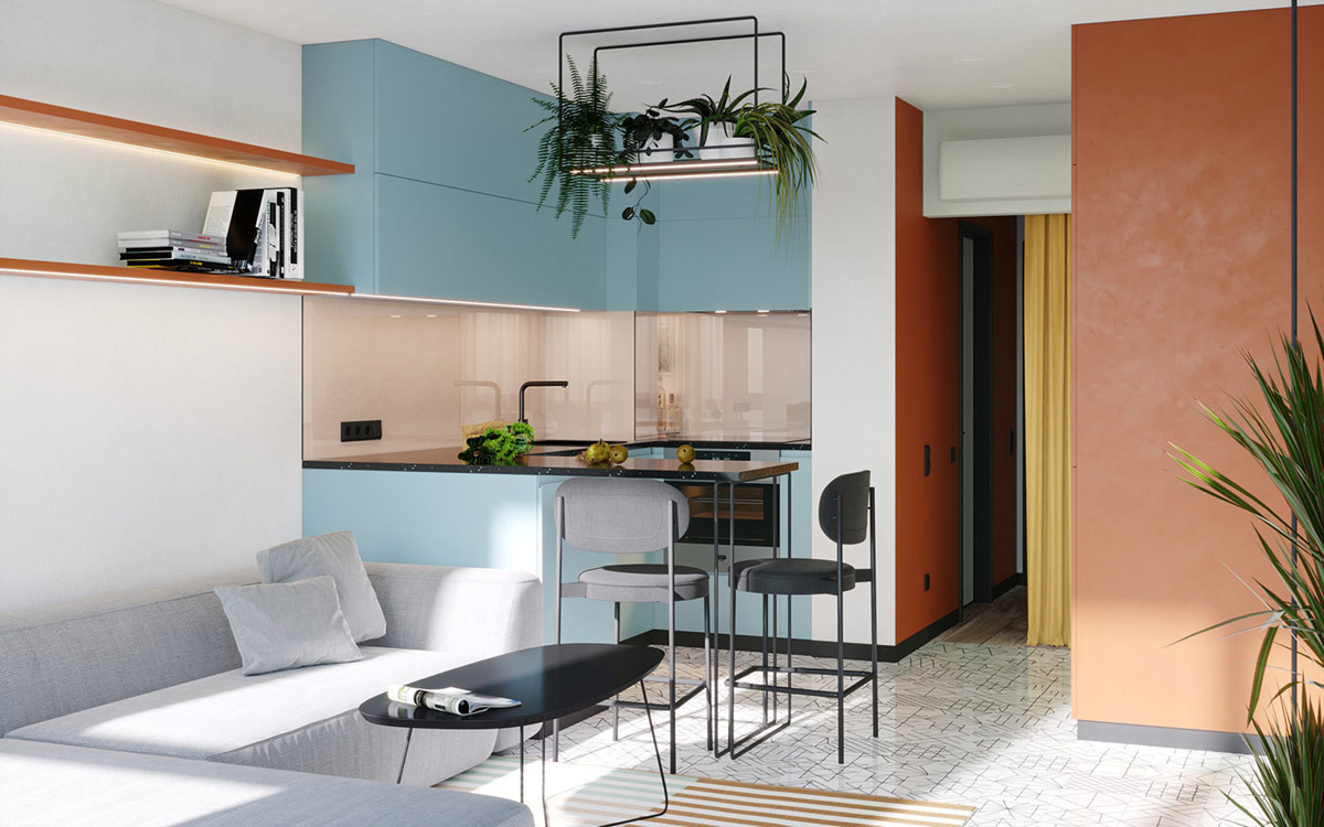 涼爽的天藍色櫥柜在小型開放式客廳角落勾勒出廚房布置。微風輕拂的顏色將烹飪區(qū)和緊湊的用餐半島區(qū)分開來。