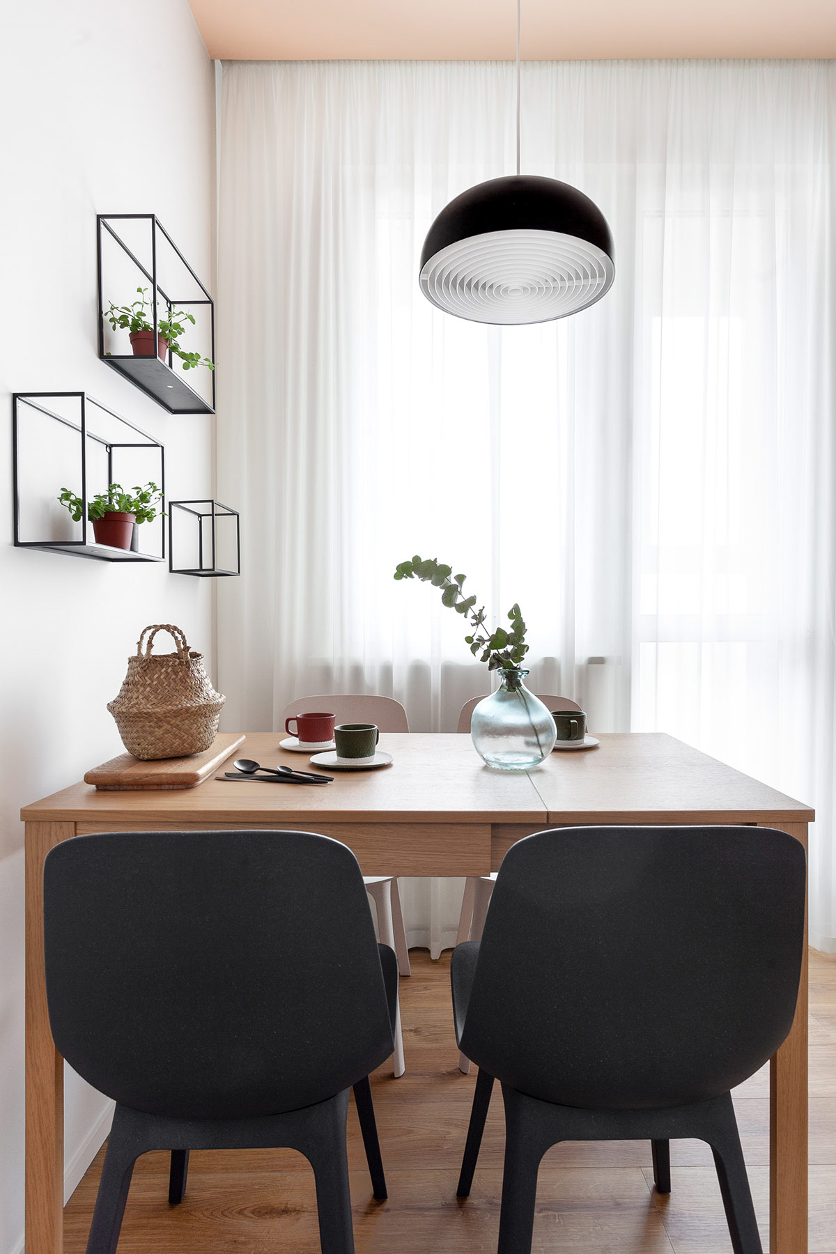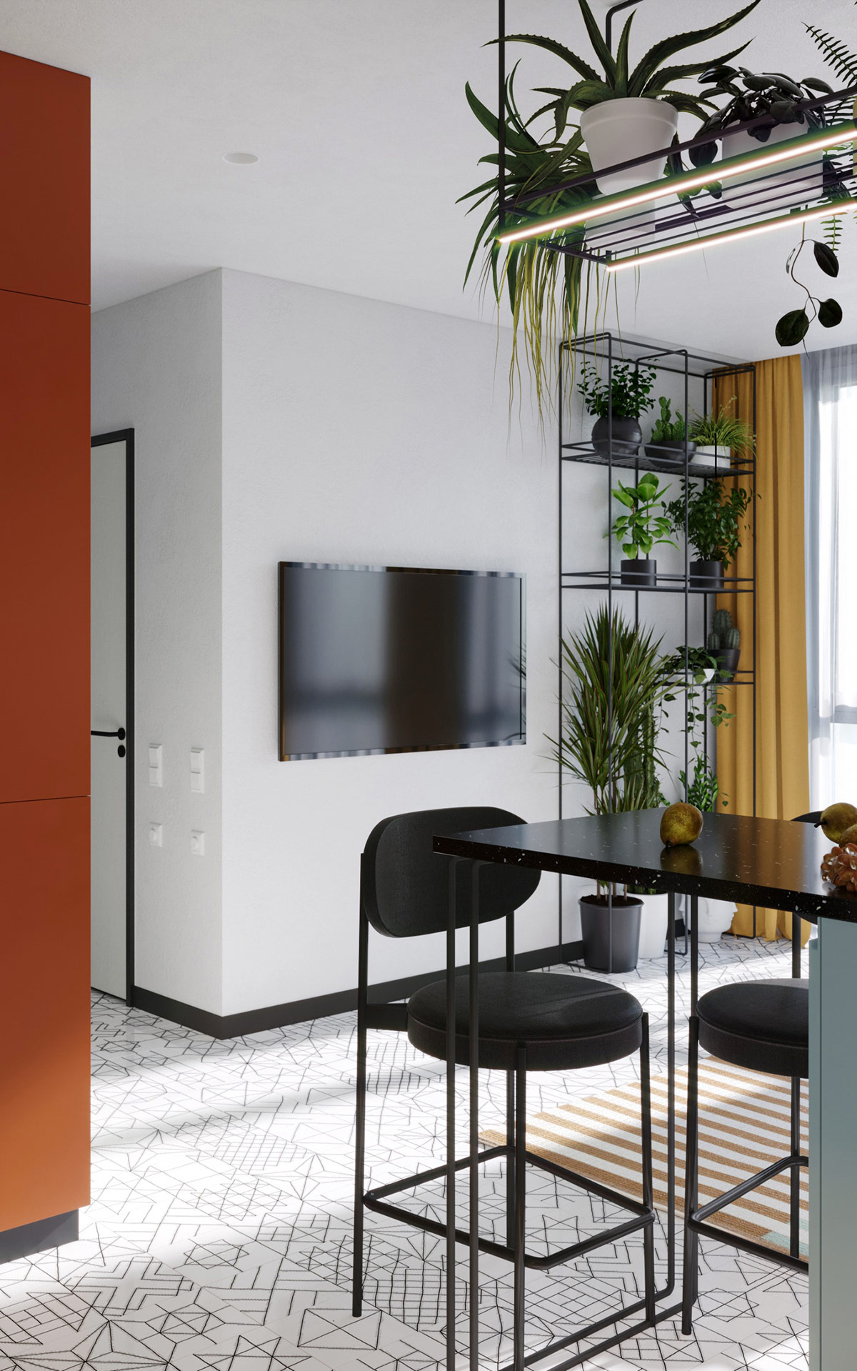 黑色廚房吧臺凳與光滑的黑色廚房臺面和相鄰休息區(qū)的咖啡桌相協(xié)調(diào)。工業(yè)線框燈和儲物架將黑色調(diào)帶到天花板上,為更有吸引力的綠色樹葉創(chuàng)造一個節(jié)省空間的家。