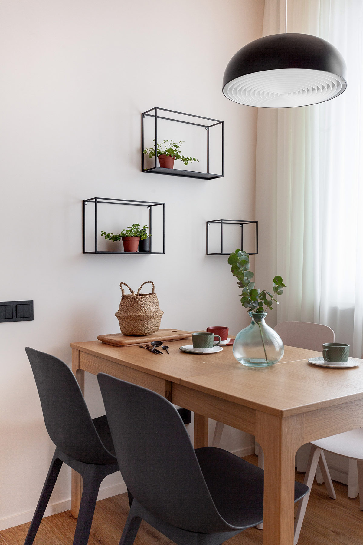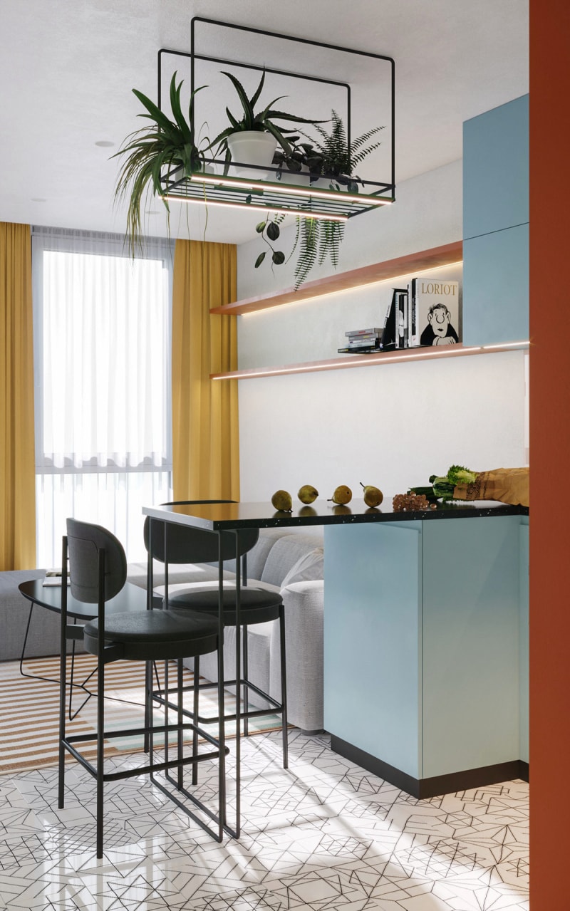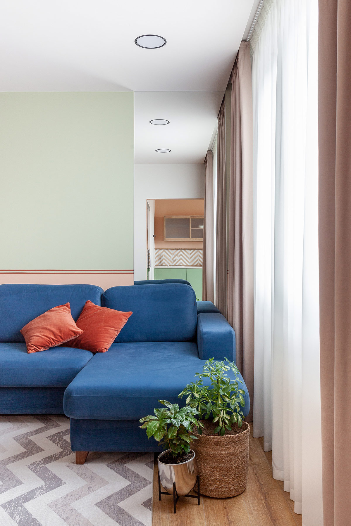 莫斯科這座色彩繽紛的公寓采用藍色、綠色和橙色的對比色打造而成。木地板和獨特的花盆帶來柔和的自然色調(diào)。