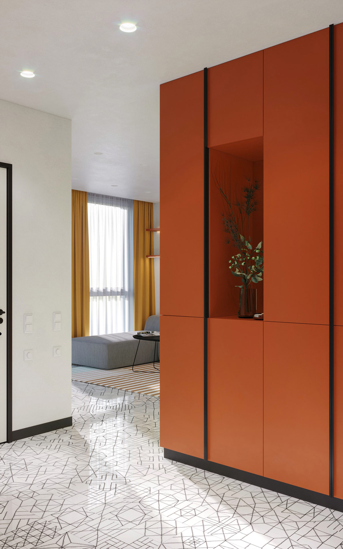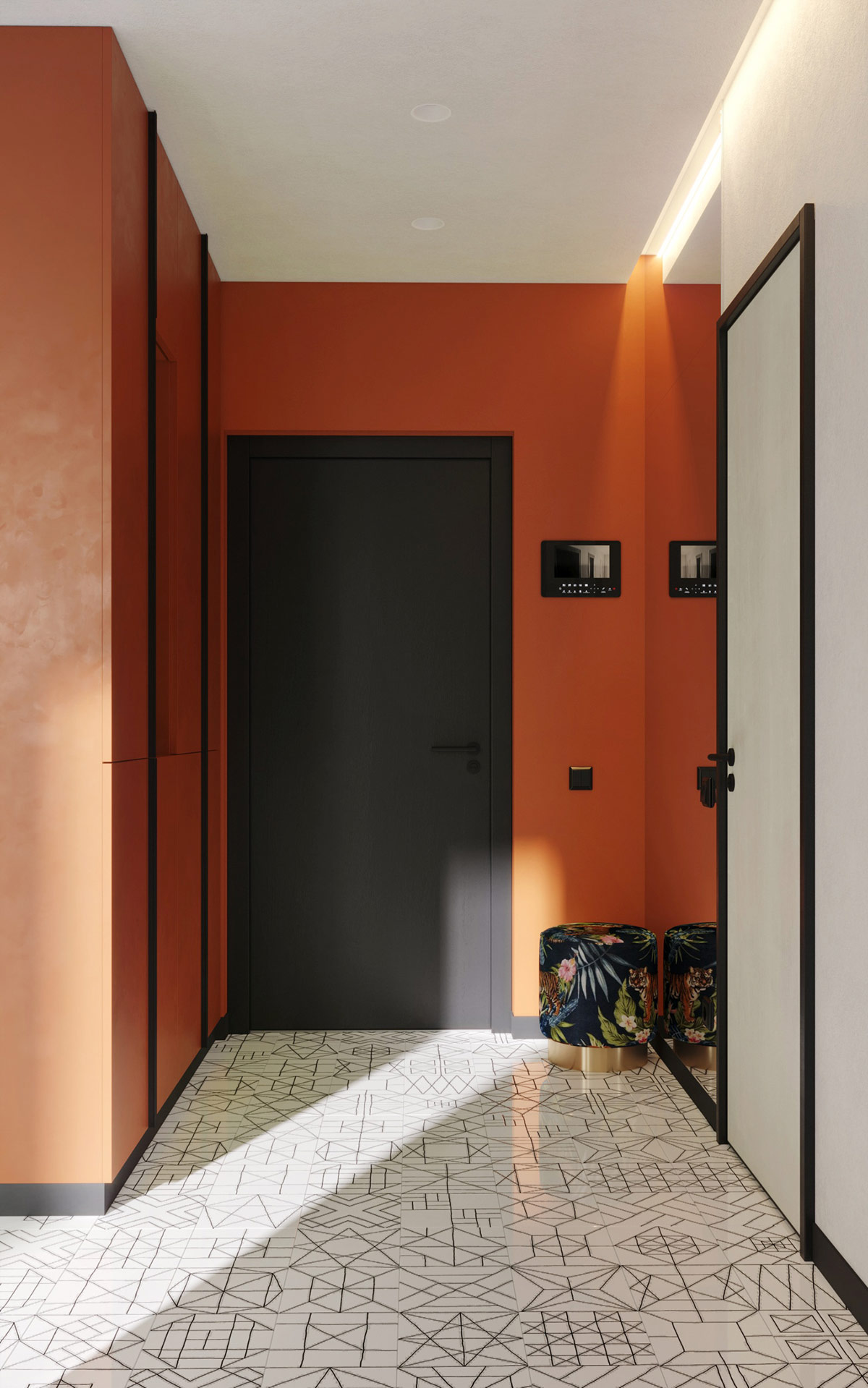 橙色的口音滲透到對比鮮明的黑色前門周圍的油漆中?;ǖ试谇度胧街苓呎彰飨陆Y(jié)合了明亮和黑暗的音符。全身無框鏡子營造出增加空間的錯覺。