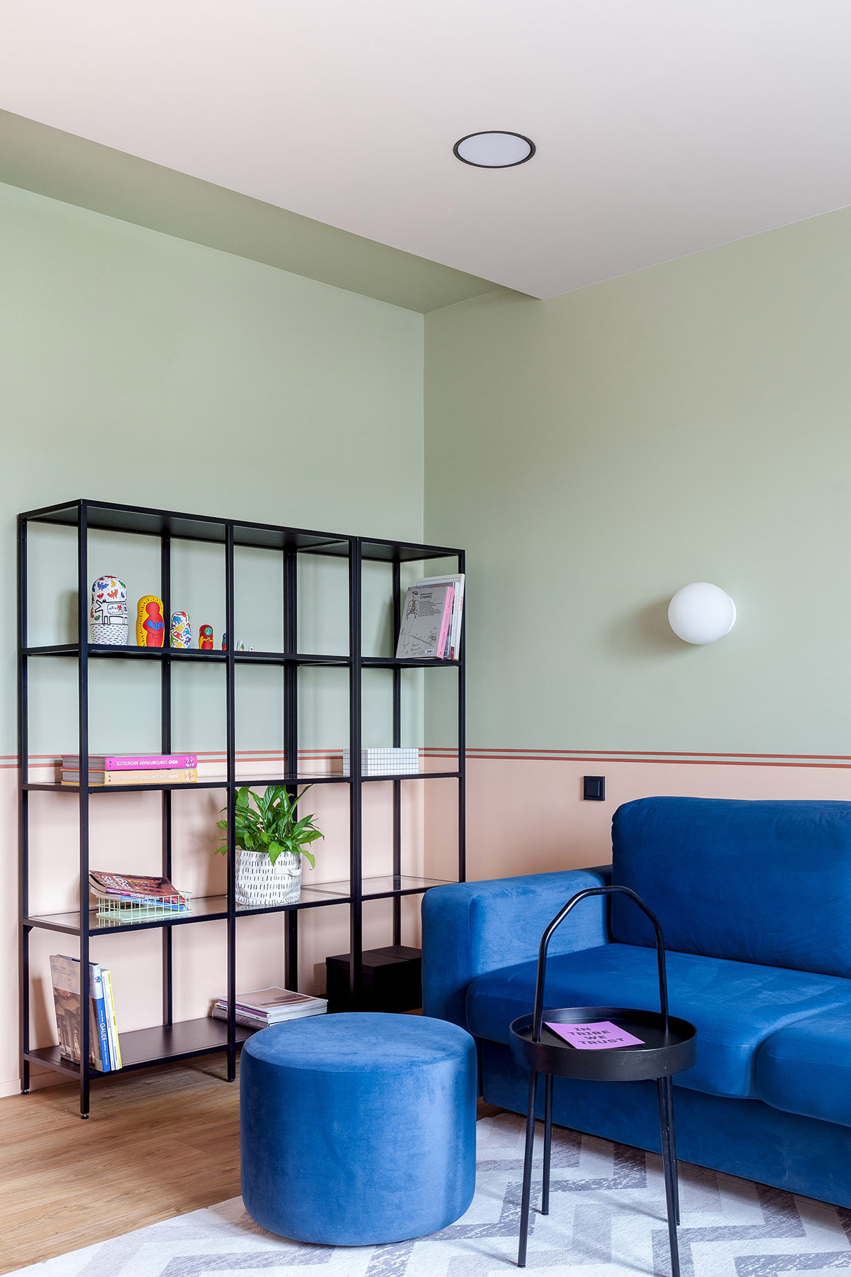 Scandi 風格的床頭柜在藍色色塊面板前呈現(xiàn)出淺紅色。合身的衣柜將藍色口音包裹在相鄰的墻壁上。