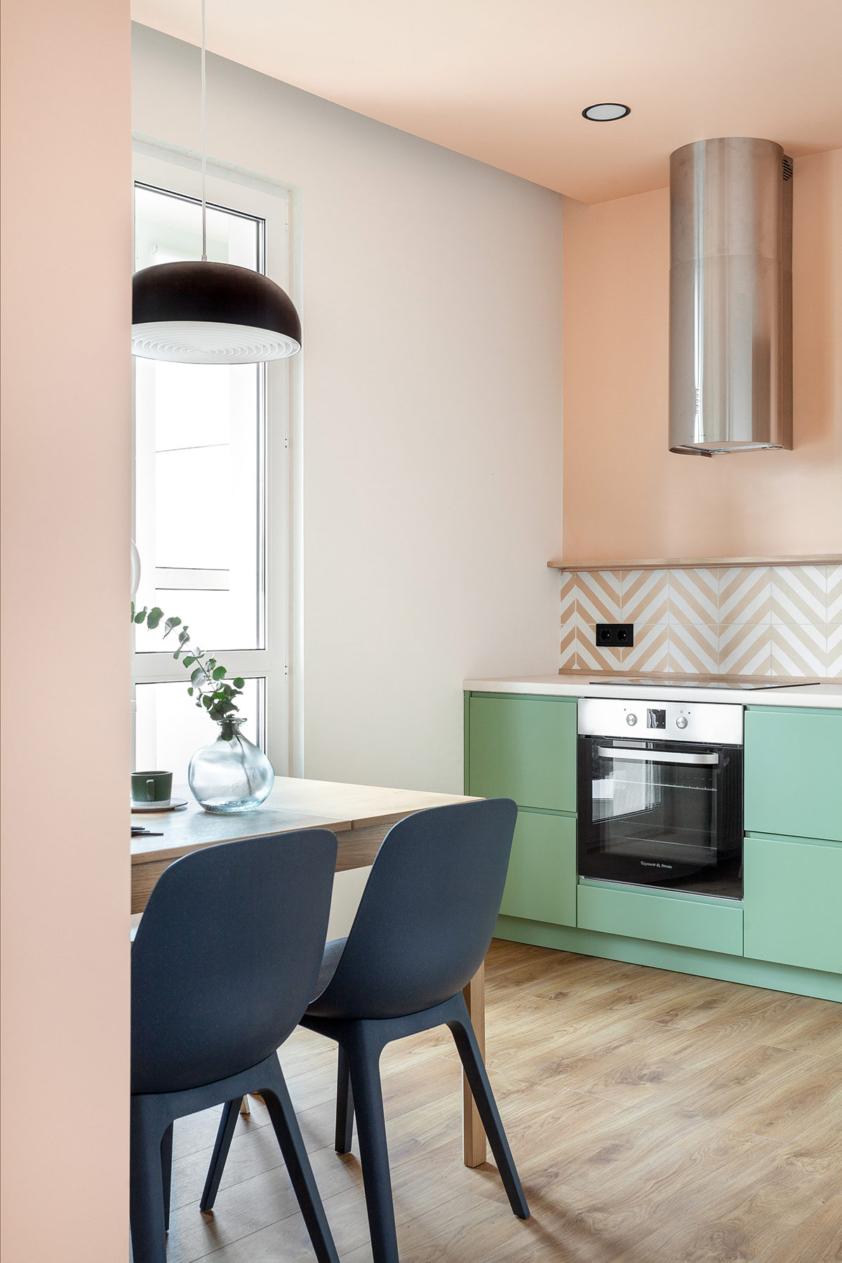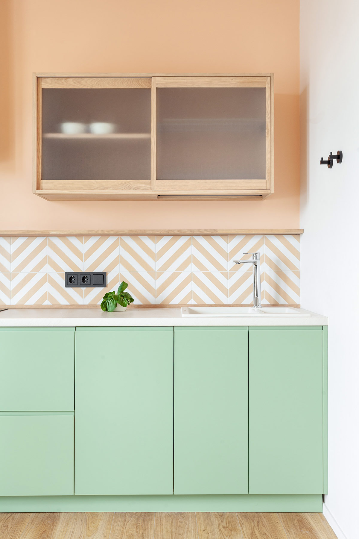 淺綠色廚柜與杏色 V 形后擋板形成鮮明對比。木質(zhì)色調(diào)的壁柜與溫暖的杏色墻漆融為一體。