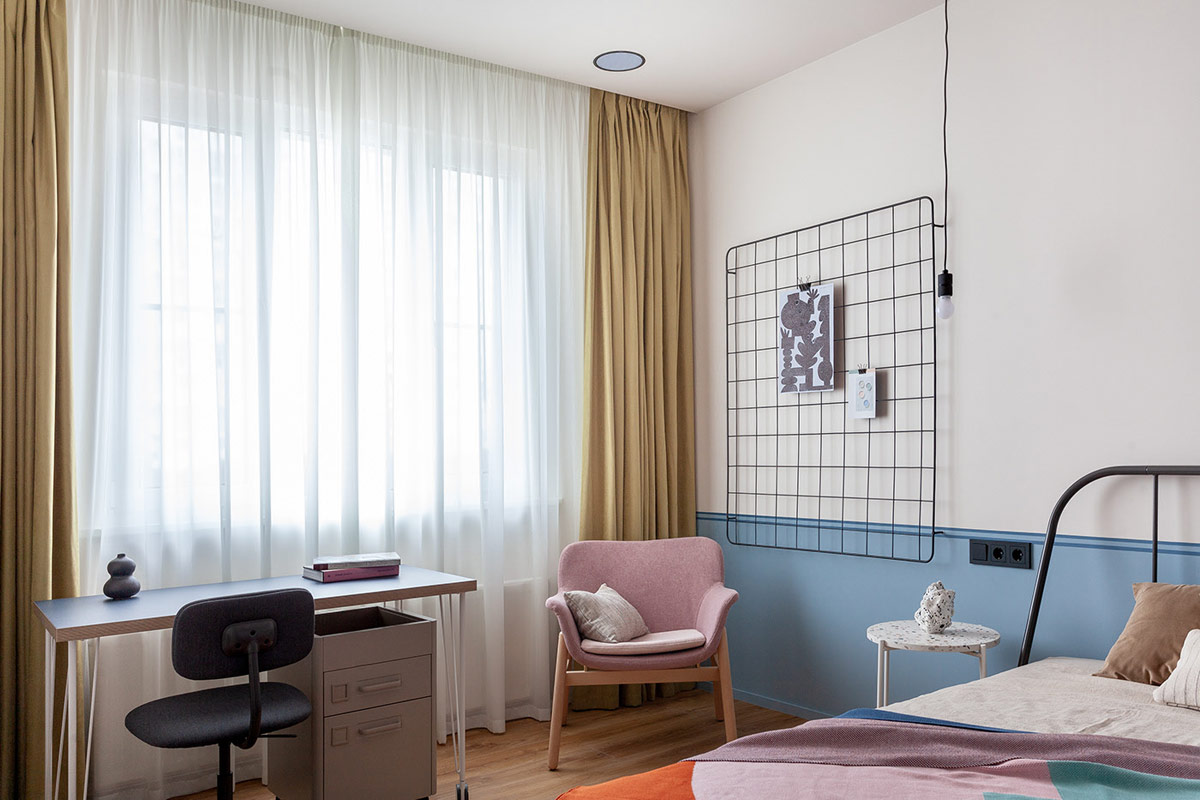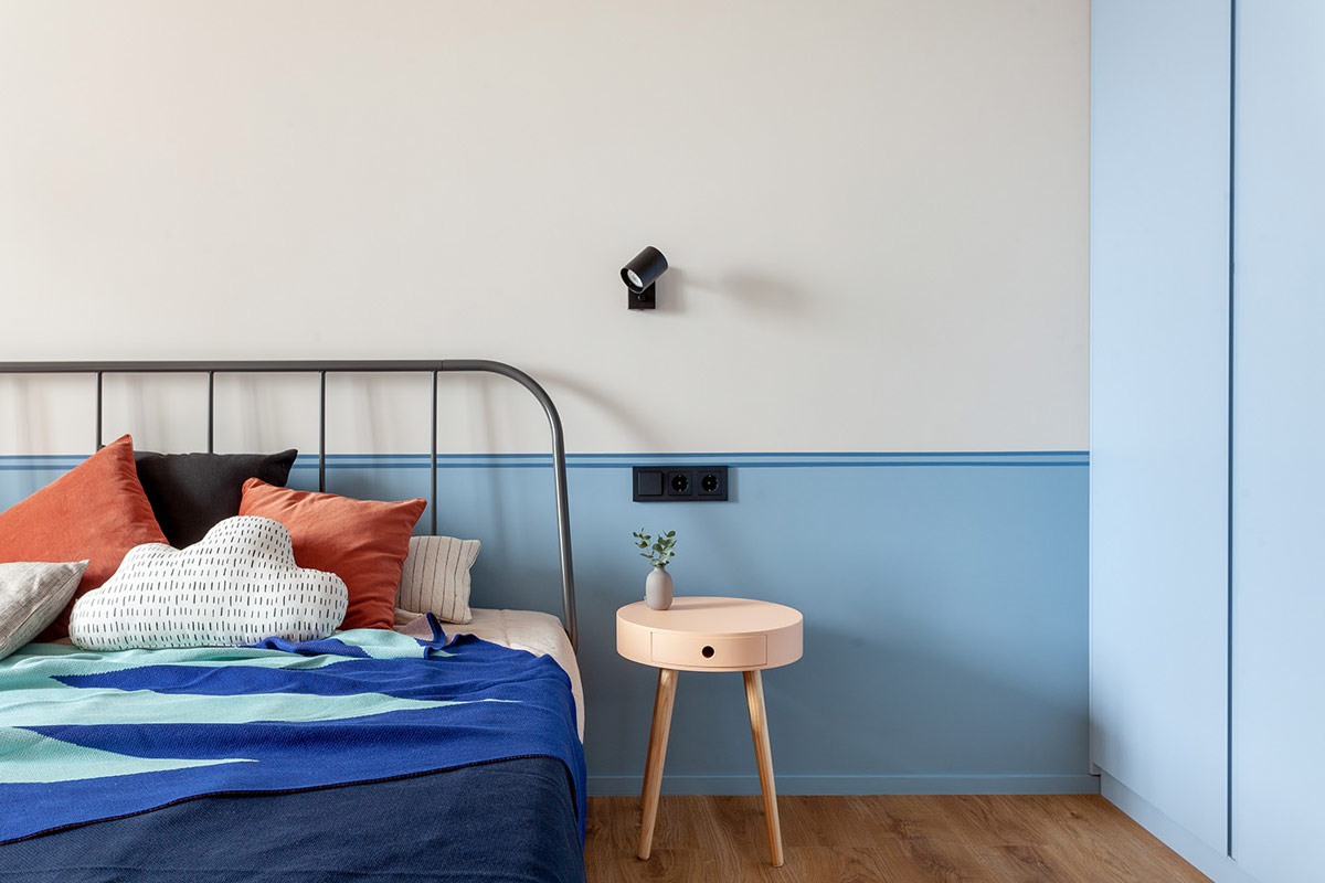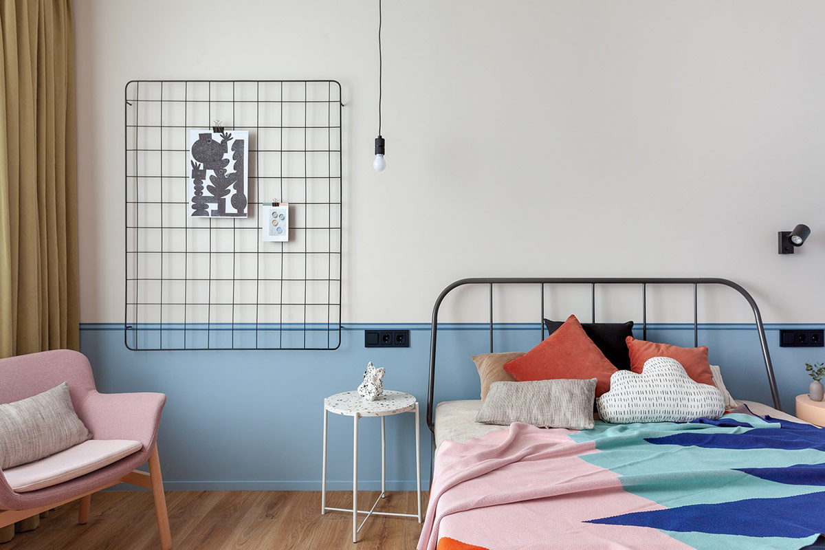 在臥室內(nèi),一條天藍色的水平色塊將明亮的圖案裝飾方案結(jié)合在一起。