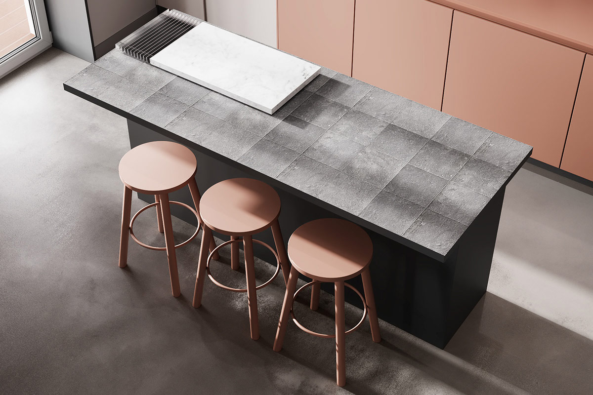 植物瓷磚在廚房的后墻上制作了一幅現(xiàn)代解構(gòu)壁畫。