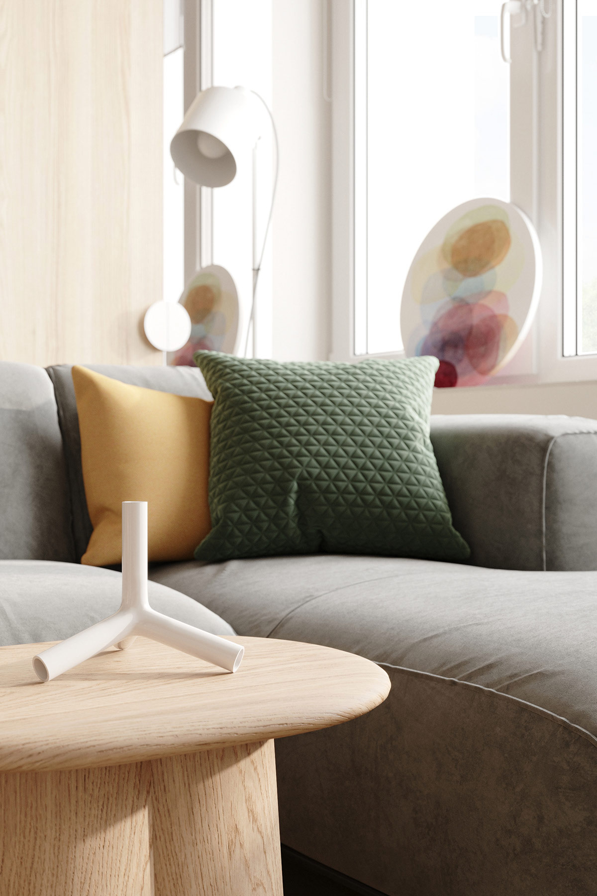 各種各樣的奶油黃色和葉綠色 抱枕將視線吸引到離用餐區(qū)最遠的沙發(fā)末端,這是另一種有效的擴大和分隔緊湊生活空間的技術(shù)。一張小咖啡桌依偎在這里的 L 形沙發(fā)的彎曲處,進一步表明該地區(qū)的獨立角色。Naoto Fukasawa 為 B&B Italia 設(shè)計的Tetra 燭臺是一件奇怪的展示品。