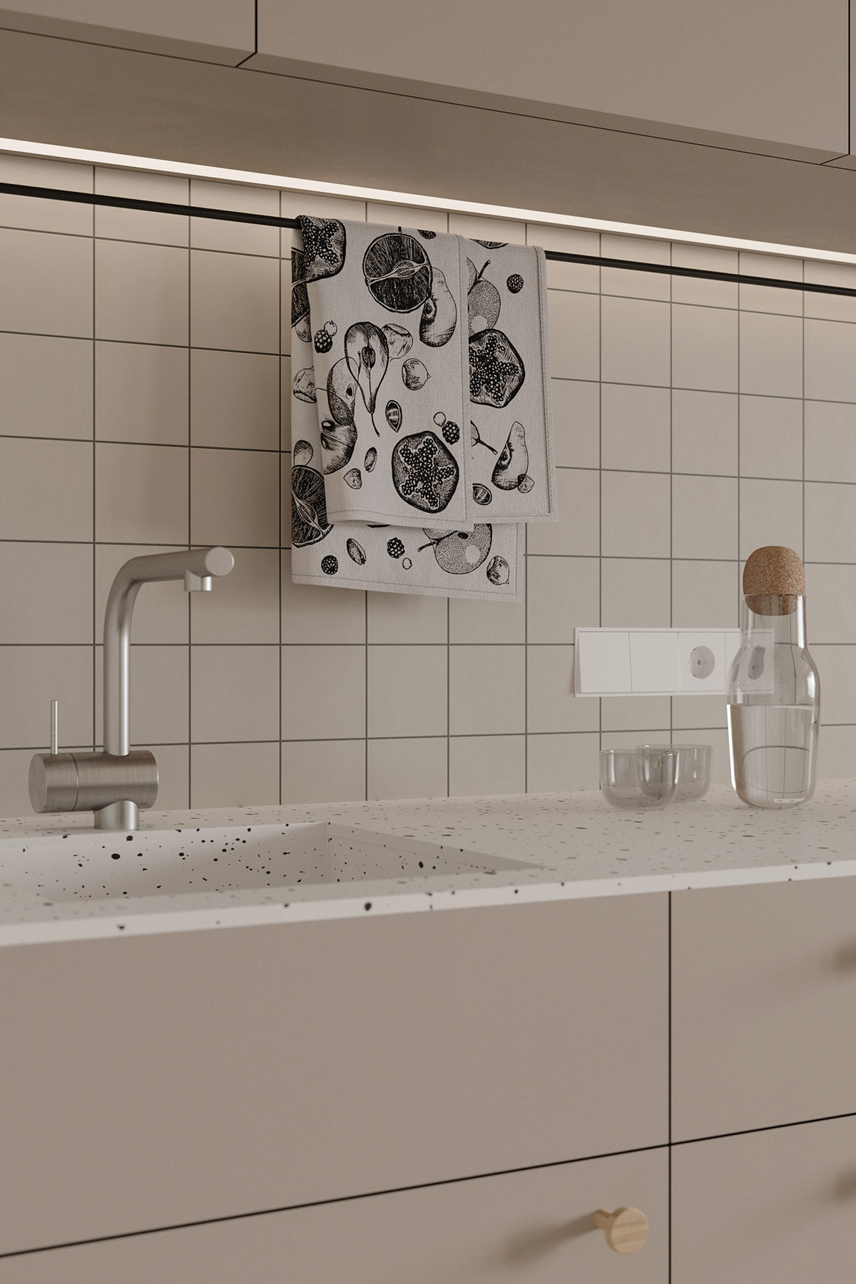 由于餐廳和廚房離休息區(qū)很近,強調(diào)色和紋理在空間的視覺劃分中變得越來越重要。也許在這個任務(wù)中最有用的是橫跨單墻廚房的灰色和木質(zhì)色調(diào)飾面?;疑珡N柜在用餐區(qū)后面營造出涼爽的背景,而淺橡木效果的櫥柜正面則在休息室后面營造出舒適的背景。