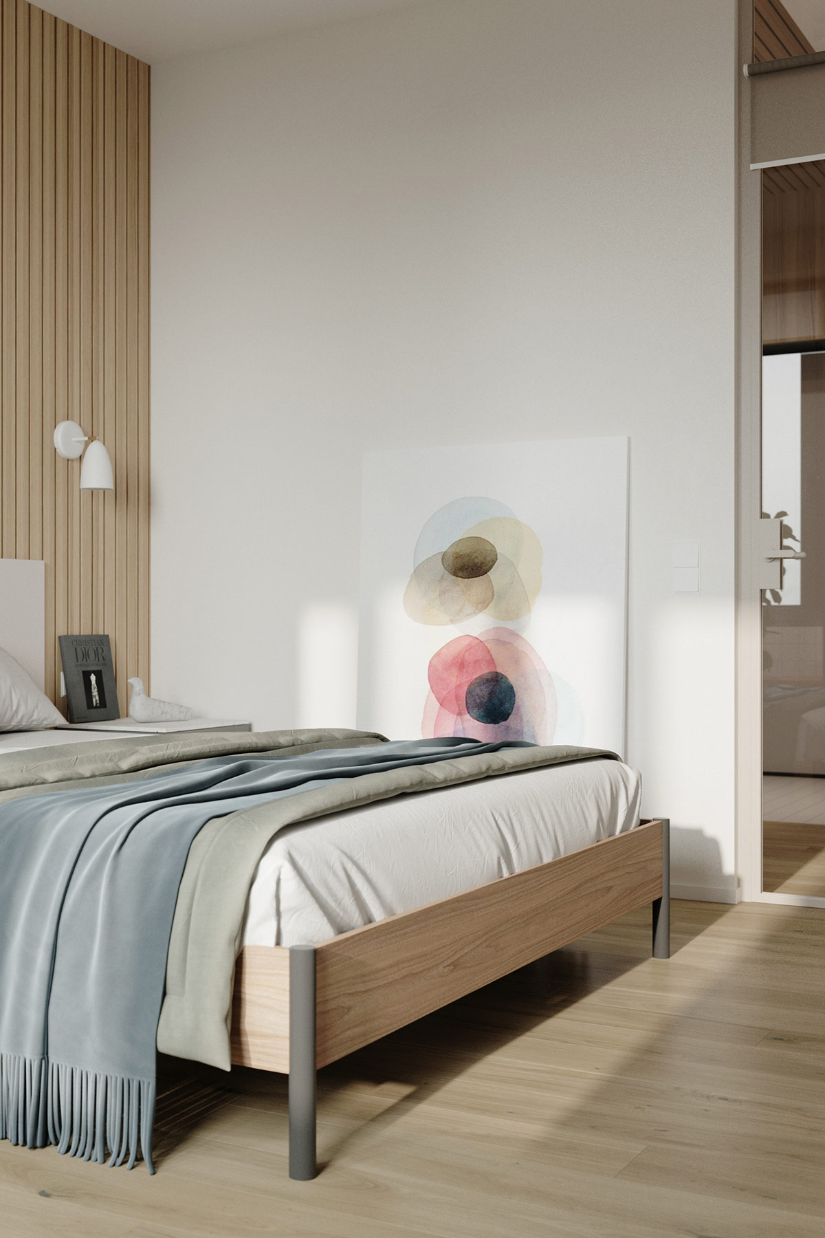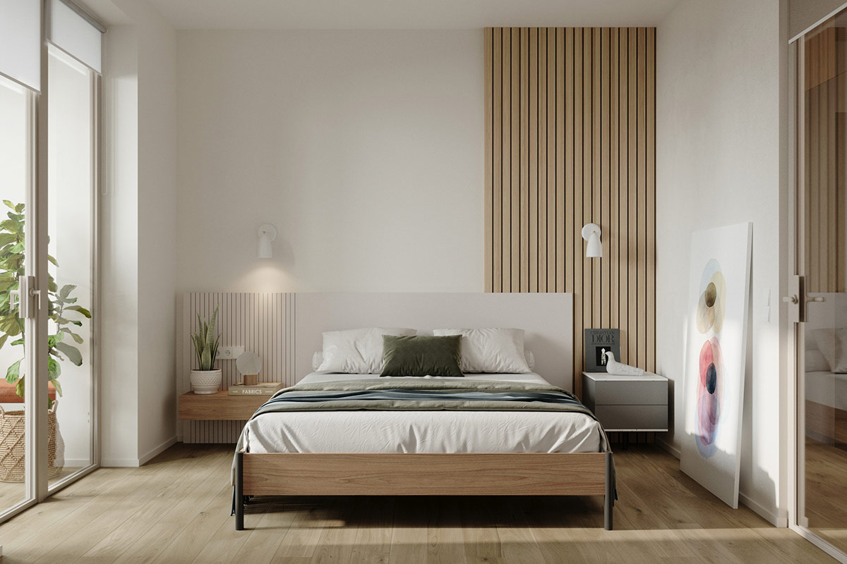 在主臥室,木板條鑲板不再用作天花板處理,而是形成時尚的床頭板特色墻。
