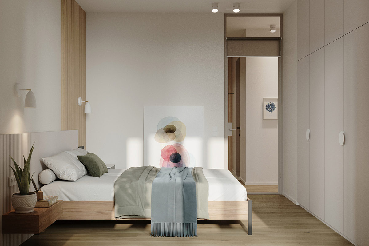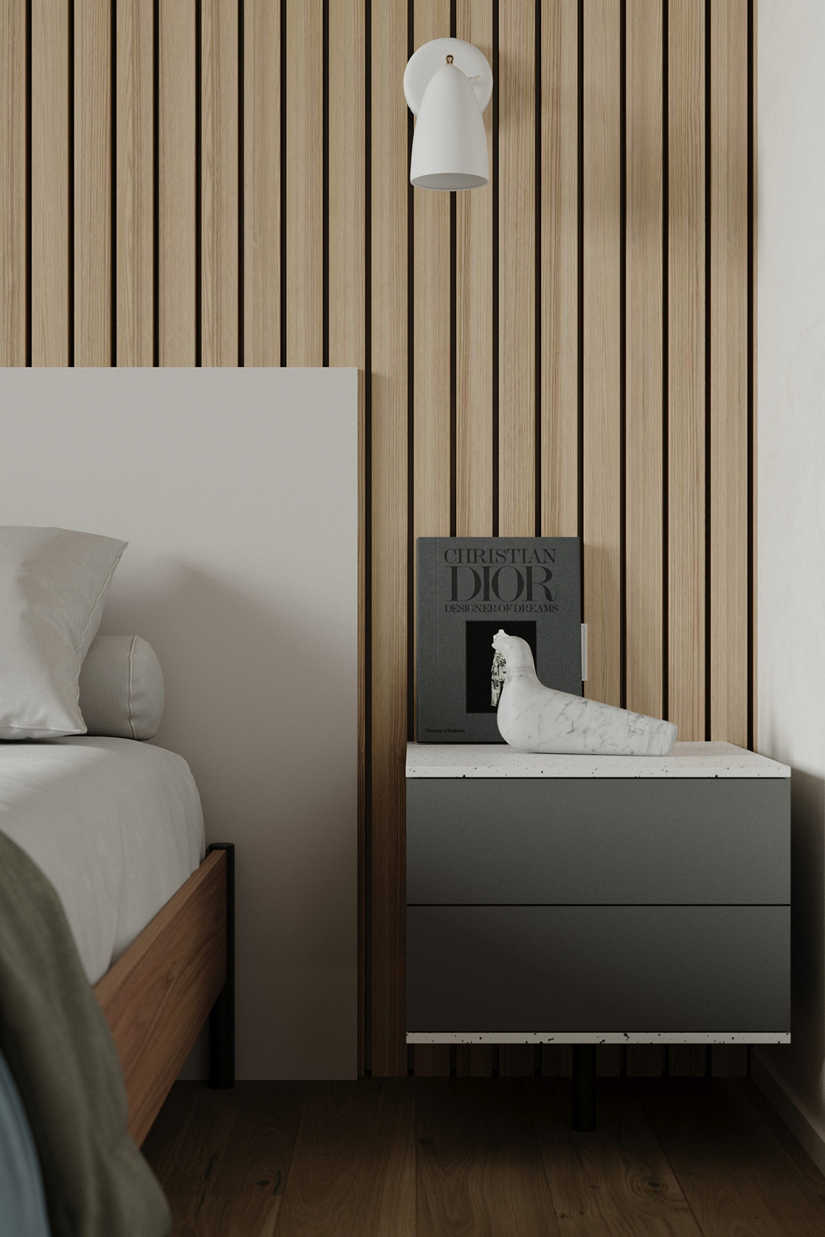 對面的床頭柜呈現(xiàn)出完全不同且對比鮮明的外觀,采用線性溫暖的木質(zhì)飾面。一個現(xiàn)代的花盆在蓬勃發(fā)展的同時擁有綠色。