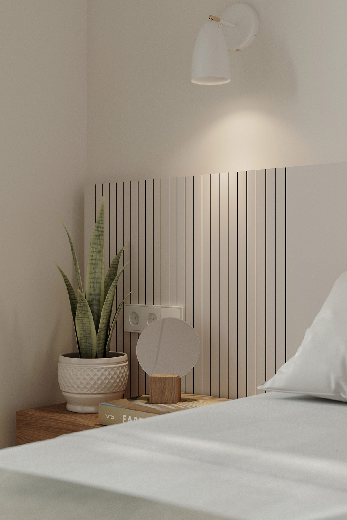 在床的這一側(cè),床頭板的設(shè)計與板條木美學相得益彰。