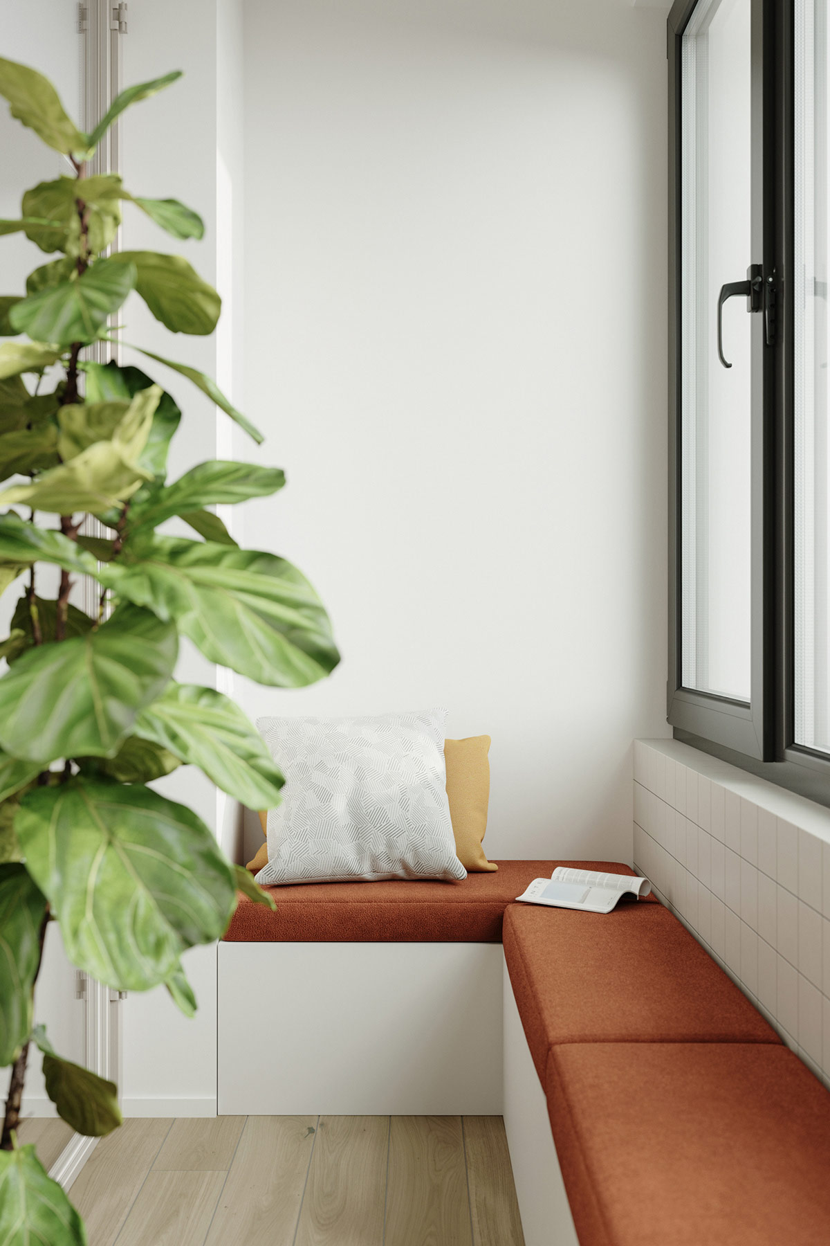 封閉的陽臺已變成一個舒適的閱讀角,配有內(nèi)置長凳和軟墊座墊。