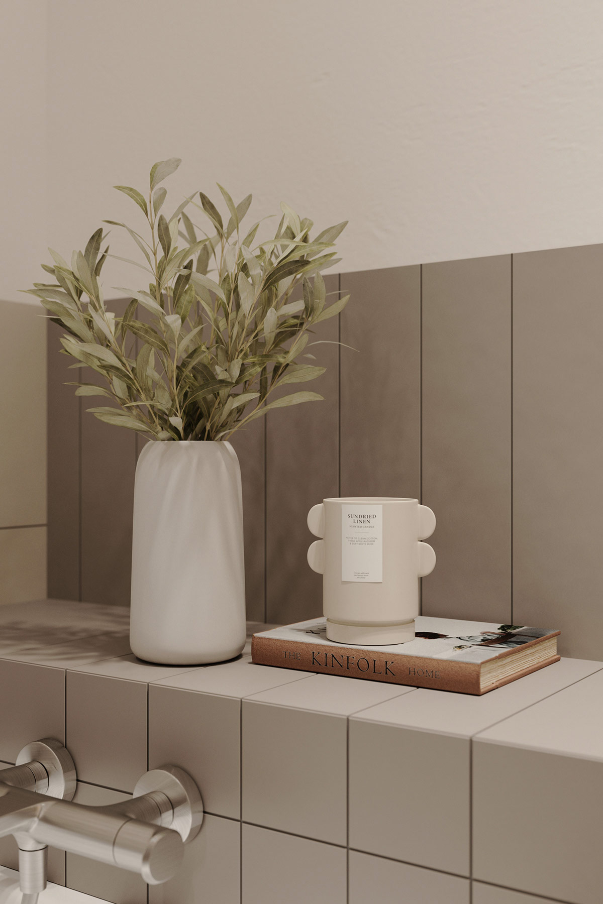 香味蠟燭和裝滿裝飾的花瓶喚起一種受寵若驚的寧靜氛圍