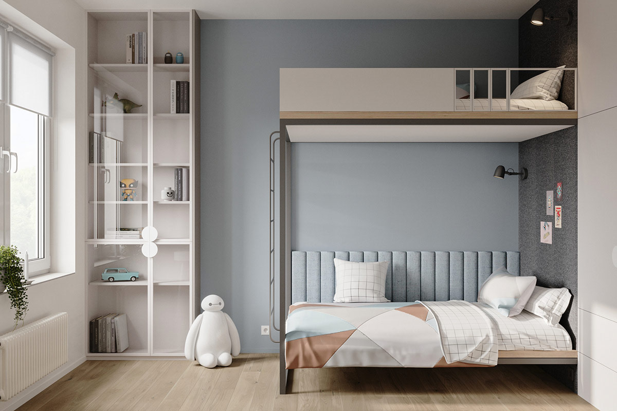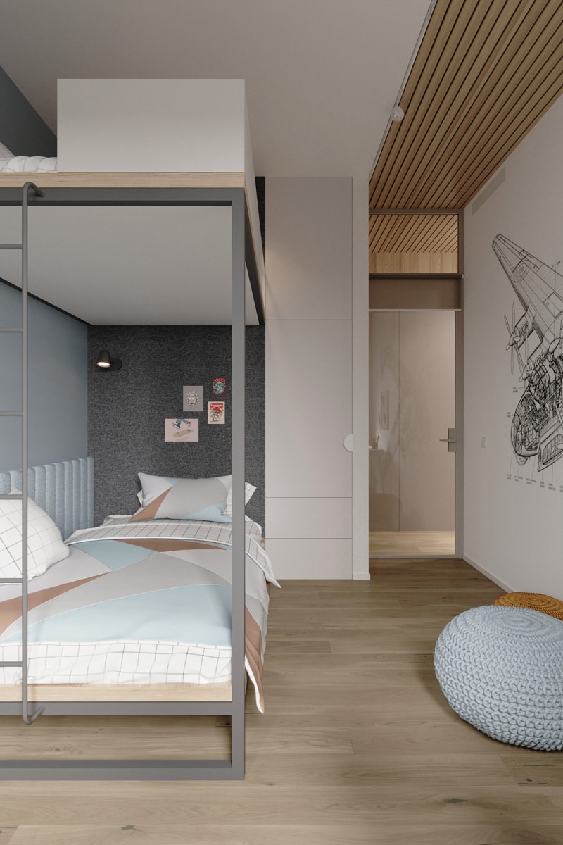 柔和的藍色油漆和配套的軟墊背板為兒童床營造出寧靜的背景。幾何形狀的羽絨被套將所有房間顏色結(jié)合在一起,形成藍色、棕色、灰色和白色印花。