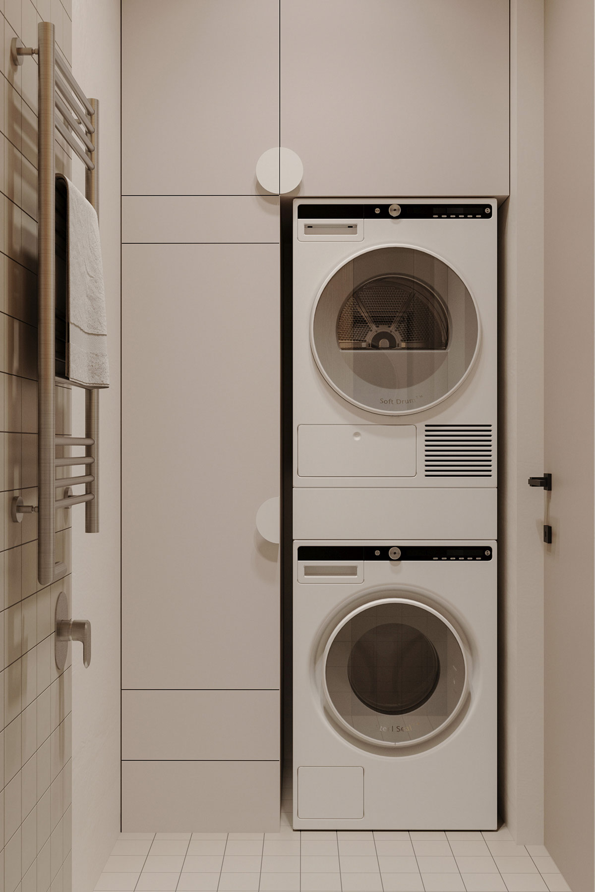 這個小浴室空間也可用作功能性洗衣房,配有堆疊式洗衣機和滾筒式烘干機。一個高大的存儲單元為洗滌劑、織物柔軟劑和去污產(chǎn)品的強制性軍械庫提供了充足的空間。