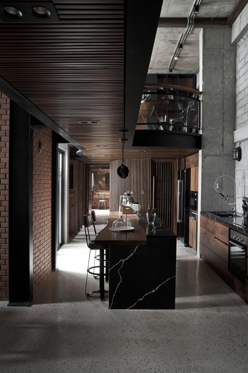 夾層走道降低了整個(gè)廚房的天花板高度,聚光燈隱藏在豐富的木飾面中。