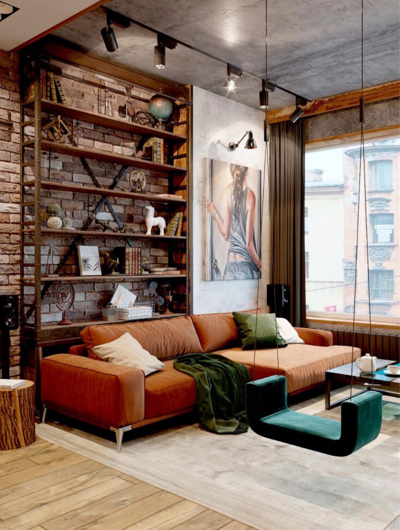 我們的第二個(gè)工業(yè)內(nèi)飾以古怪、多彩的裝飾為特色,就像休息室里這把獨(dú)特的綠色秋千椅。