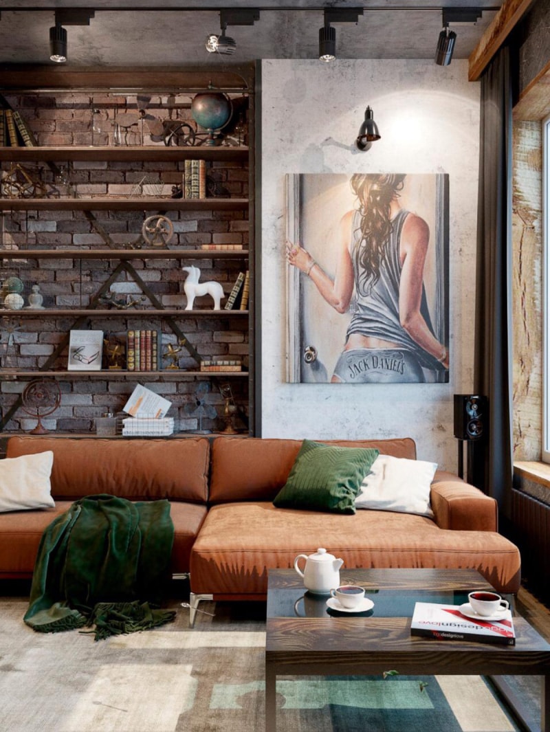 綠色散落的靠墊和相配的地毯與赤褐色沙發(fā)內(nèi)飾形成鮮明對(duì)比。黑色的工業(yè)壁燈照亮了藝術(shù)品和原始的混凝土背景。裸露的磚墻支撐著書架。