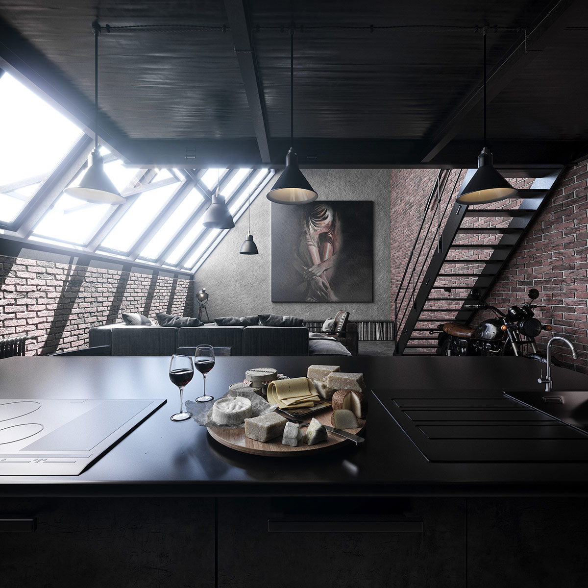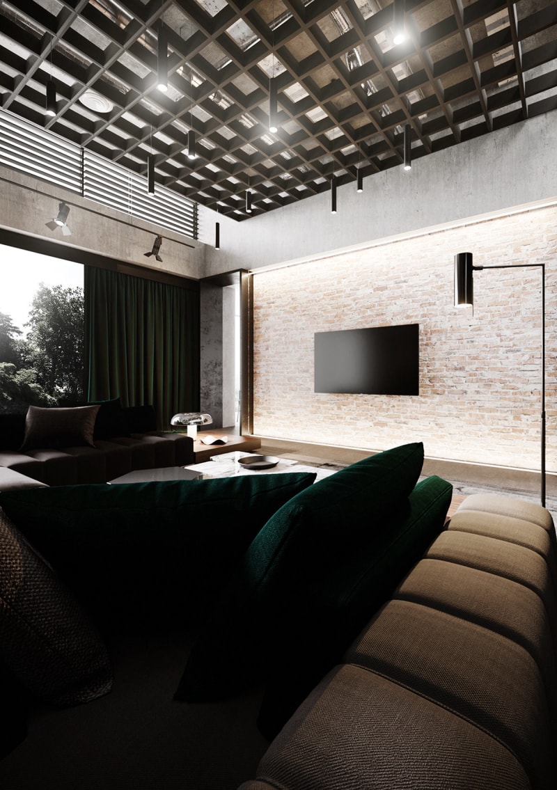 當(dāng)我們進(jìn)入我們的第三個(gè)特色家居室內(nèi)時(shí),一個(gè)巨大的天窗令人瞠目結(jié)舌。深紅色的磚砌引起人們對(duì)開放概念空間的深度和令人難以置信的高度的關(guān)注。