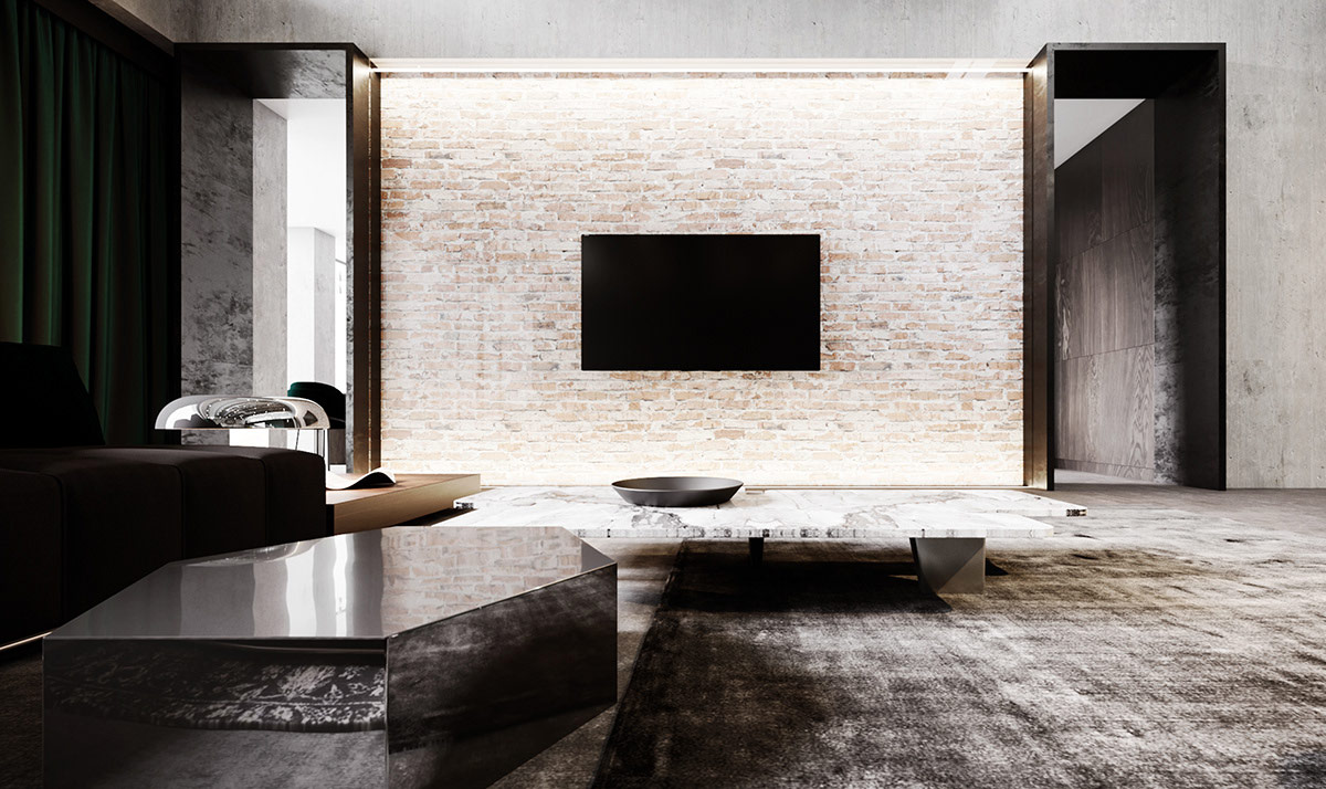 外圍照明框架明亮地照亮了裸露的磚電視墻。