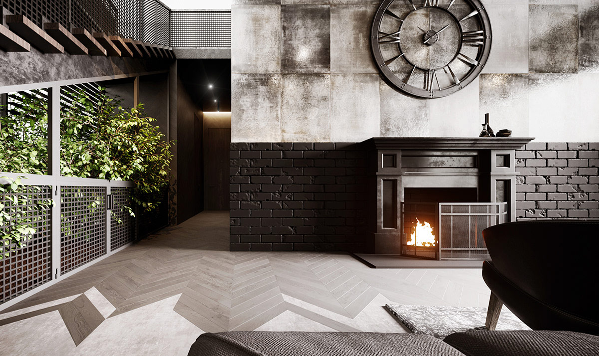 黑色彩繪磚墻擴(kuò)展了深色壁爐的效果。在此處查看壁爐屏幕靈感。