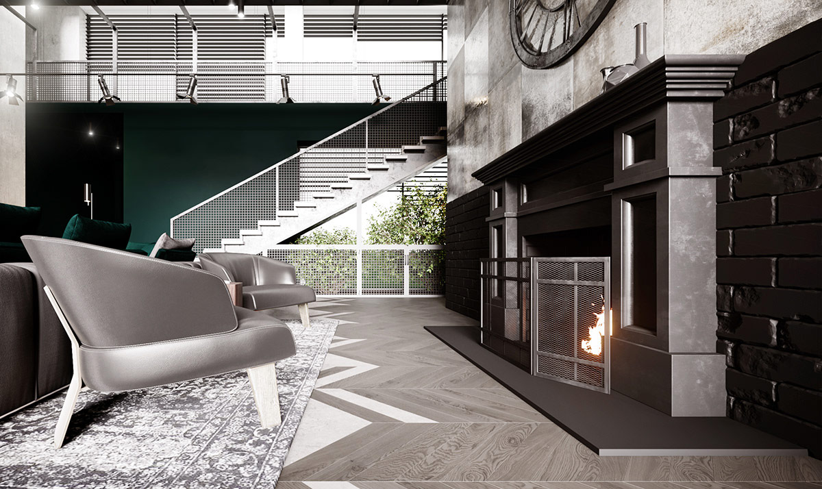 兩把棕色 皮椅坐在休息室布置的炭灰色軟墊沙發(fā)對(duì)面,以時(shí)尚豐富而有趣的色調(diào)分層。一株大型室內(nèi)植物與紅磚形成鮮明對(duì)比,將視線引向夾層地板的下方。