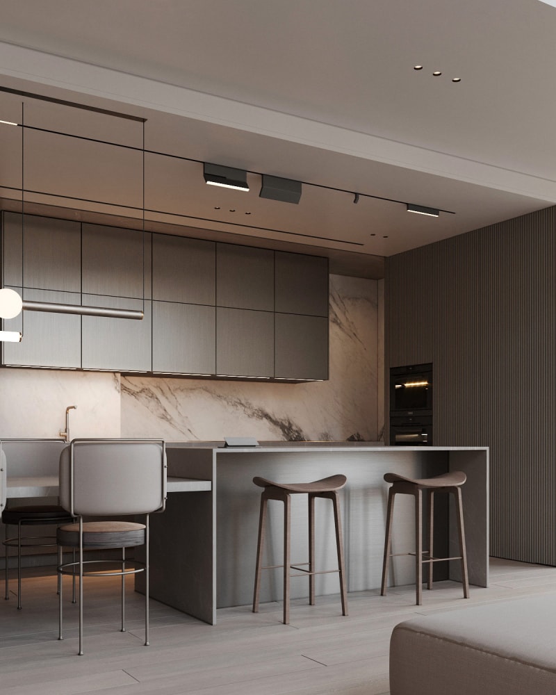 一個(gè)大理石廚房后擋板上升兩倍左右存入銀行柜。集成電器嵌入深色板條紋理的墻壁中。