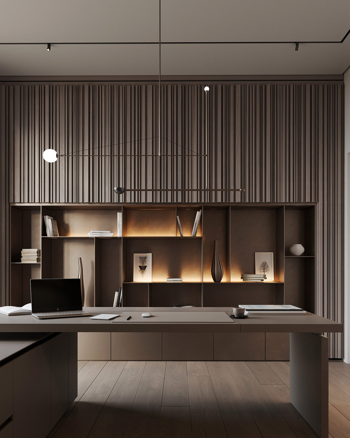 L 形辦公桌的底座具有充足的存儲(chǔ)空間,可避免視覺辦公室的混亂。背光書柜提供了一個(gè)展示精心挑選的裝飾品系列的地方。