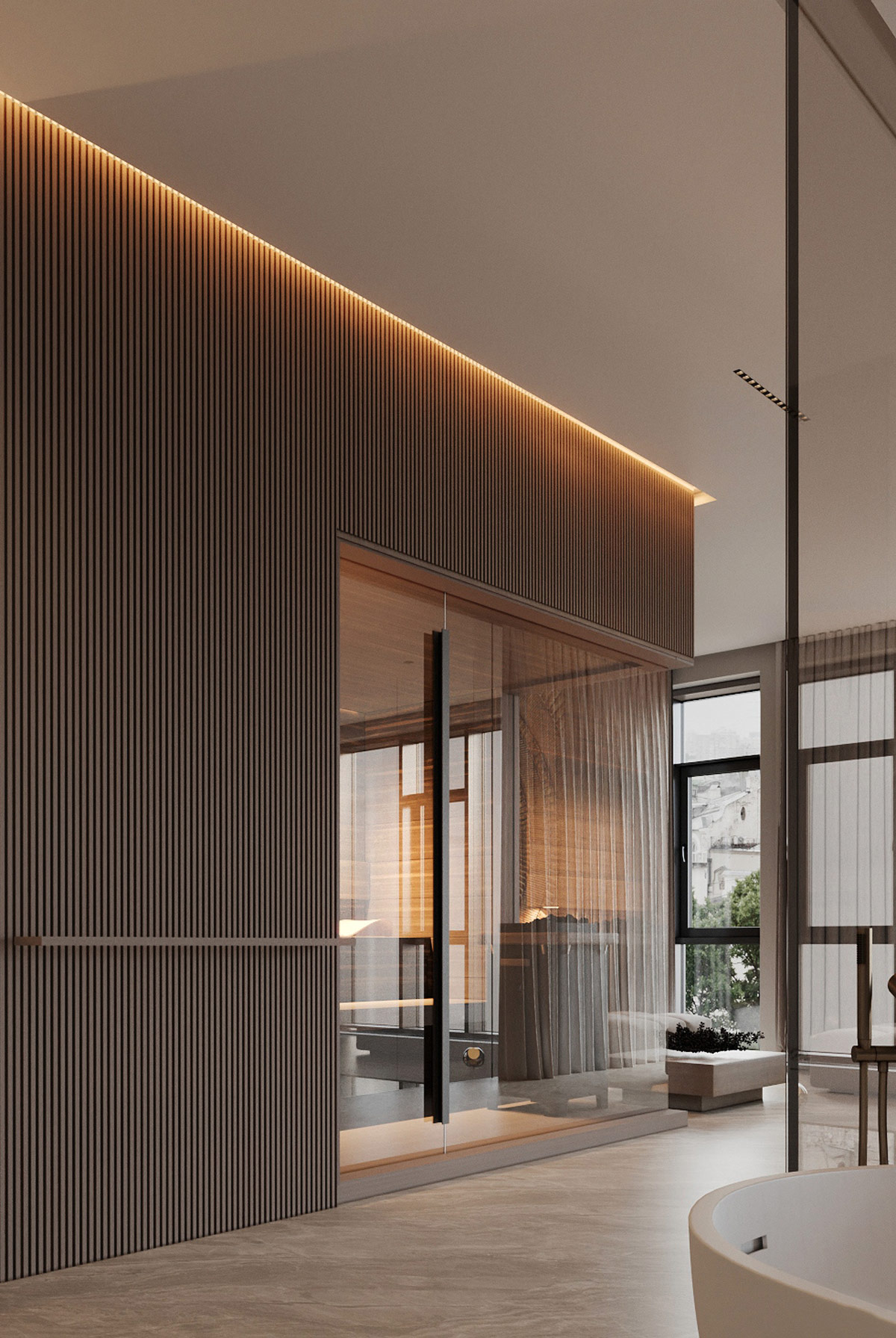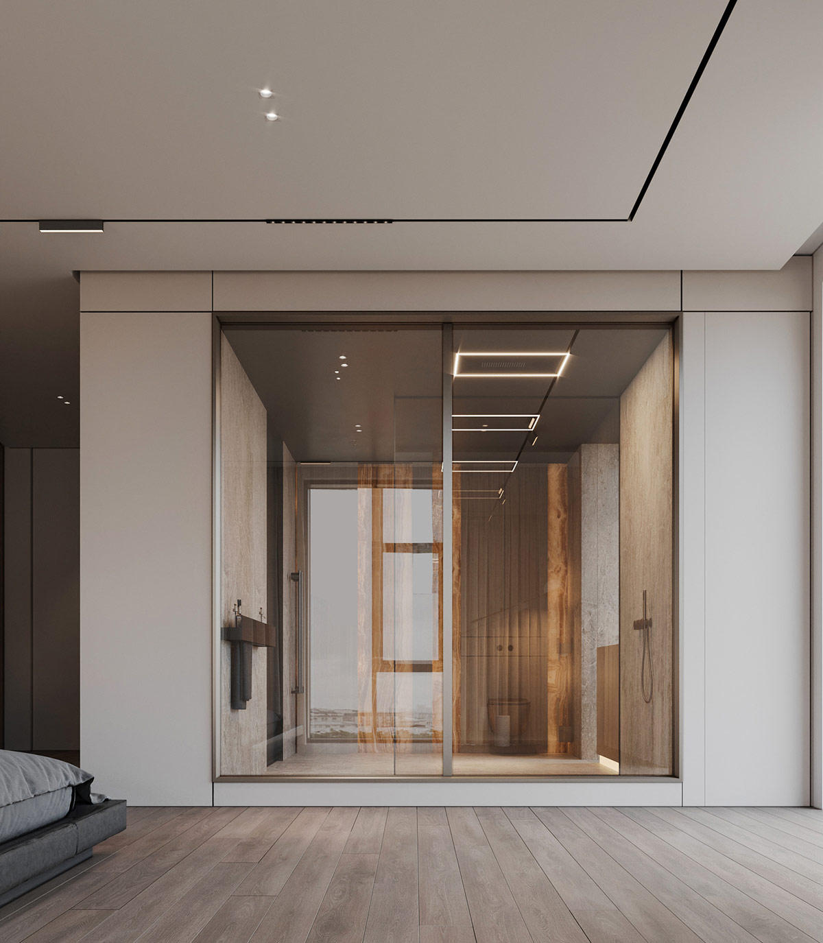 玻璃墻套間為臥室增添了深度。