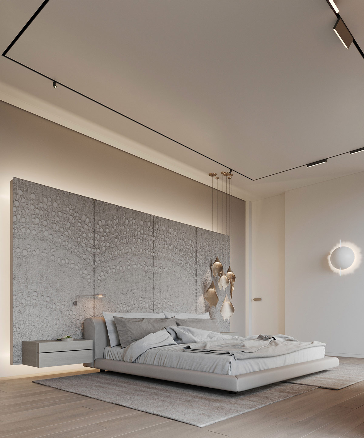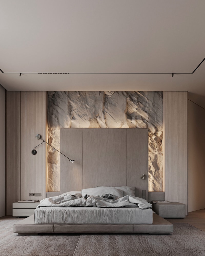 浮動(dòng)床頭柜貼在帶紋理的藝術(shù)墻上。