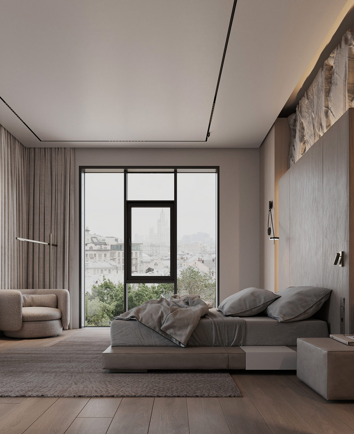 灰色的窗簾聚集在房間的角落,為臥室的閱讀角創(chuàng)造了一個(gè)舒適的背景。