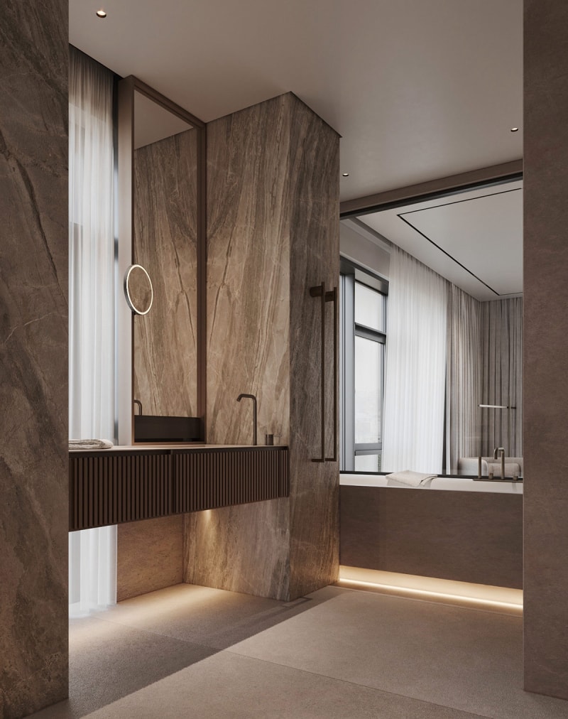 馬桶水箱隱藏墻采用精美照明的嵌入式大理石面板。