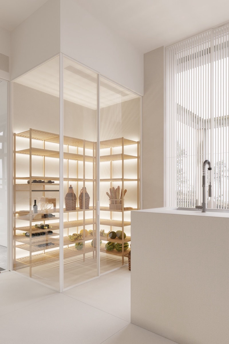 由于木架子和精心布置的照明,食品儲(chǔ)藏室成為家庭設(shè)計(jì)的一部分。角落照亮了房間,讓您在需要時(shí)輕松找到所需的東西。
